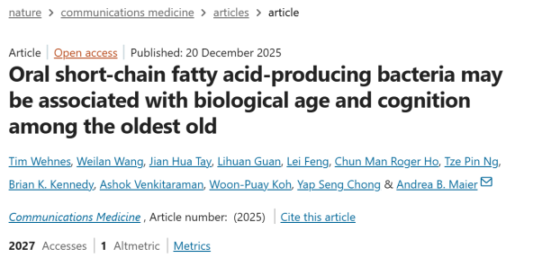 研究成果发表在论文《Oral short-chain fatty acid-producing bacteria may be associated with biological age and cognition among the oldest old》中,为理解健康老龄化打开了新的窗口。