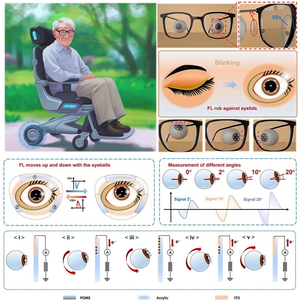为此,团队基于摩擦纳米发电机原理构建了新系统。该技术通过摩擦起电与静电感应将机械能转化为电能,可从眨眼等低频运动中采集能量。该系统不仅能收集足够电能实现自供能,还能以99%的精度检测小至2度的眼球运动。
