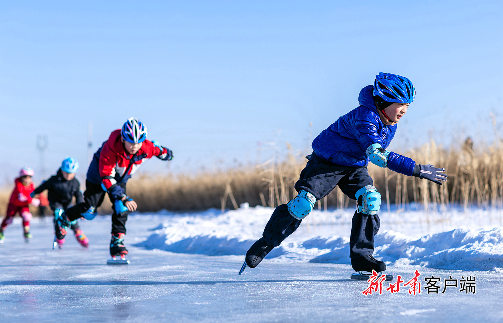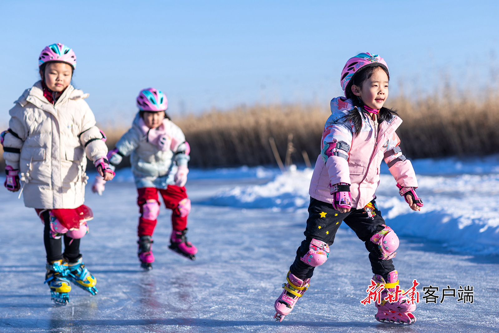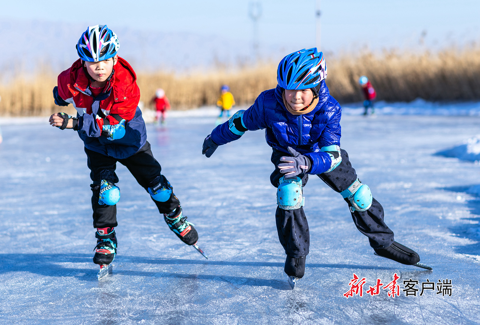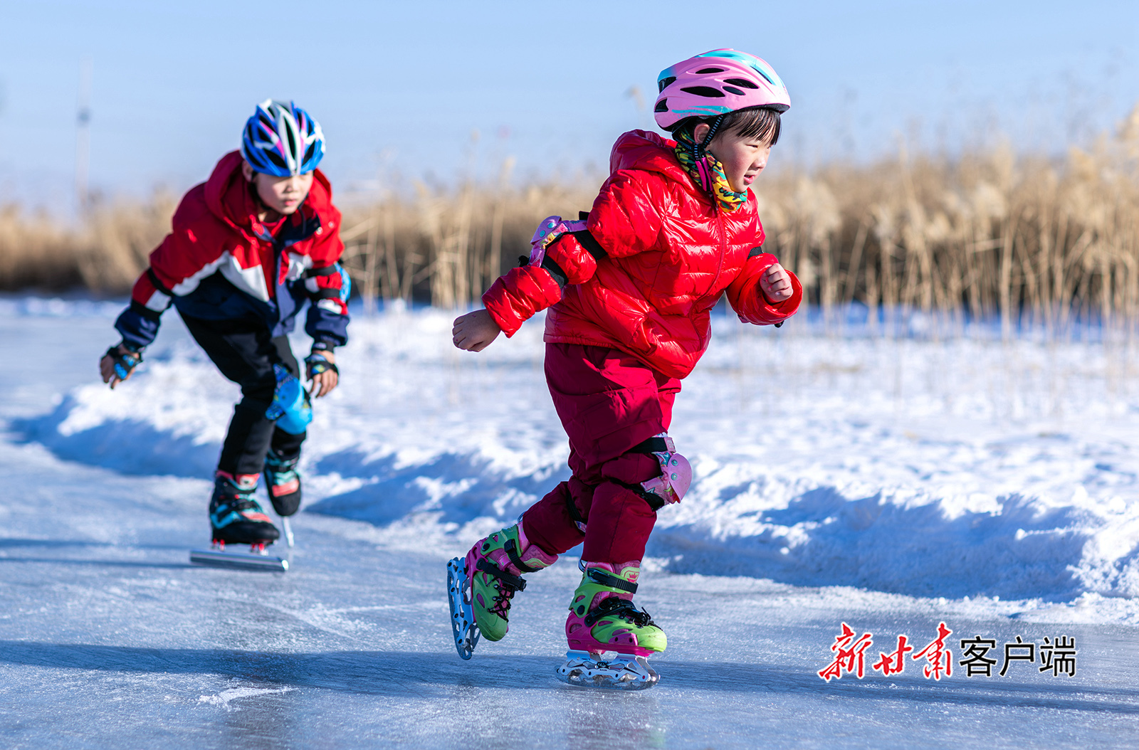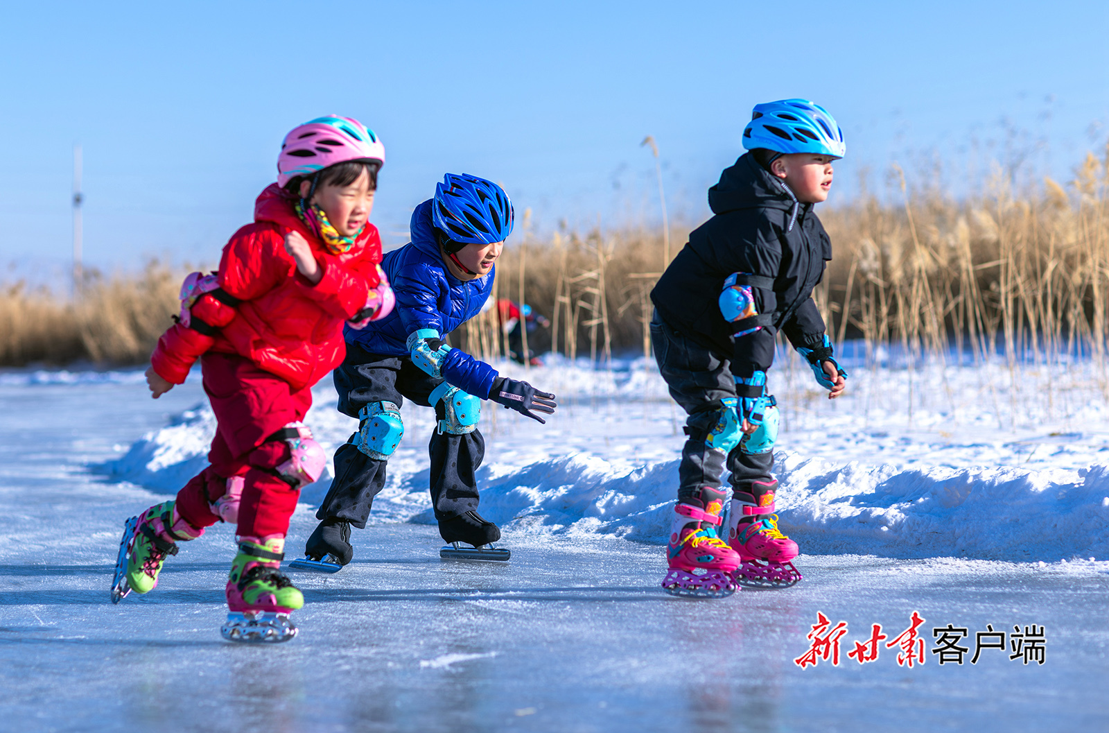 1月11日,小朋友在张掖国家湿地公园冰场滑冰健身。寒假伊始,当地众多中小学生走进张掖国家湿地公园冰场,在冰雪运动中强健体魄,解锁别样欢乐假期。