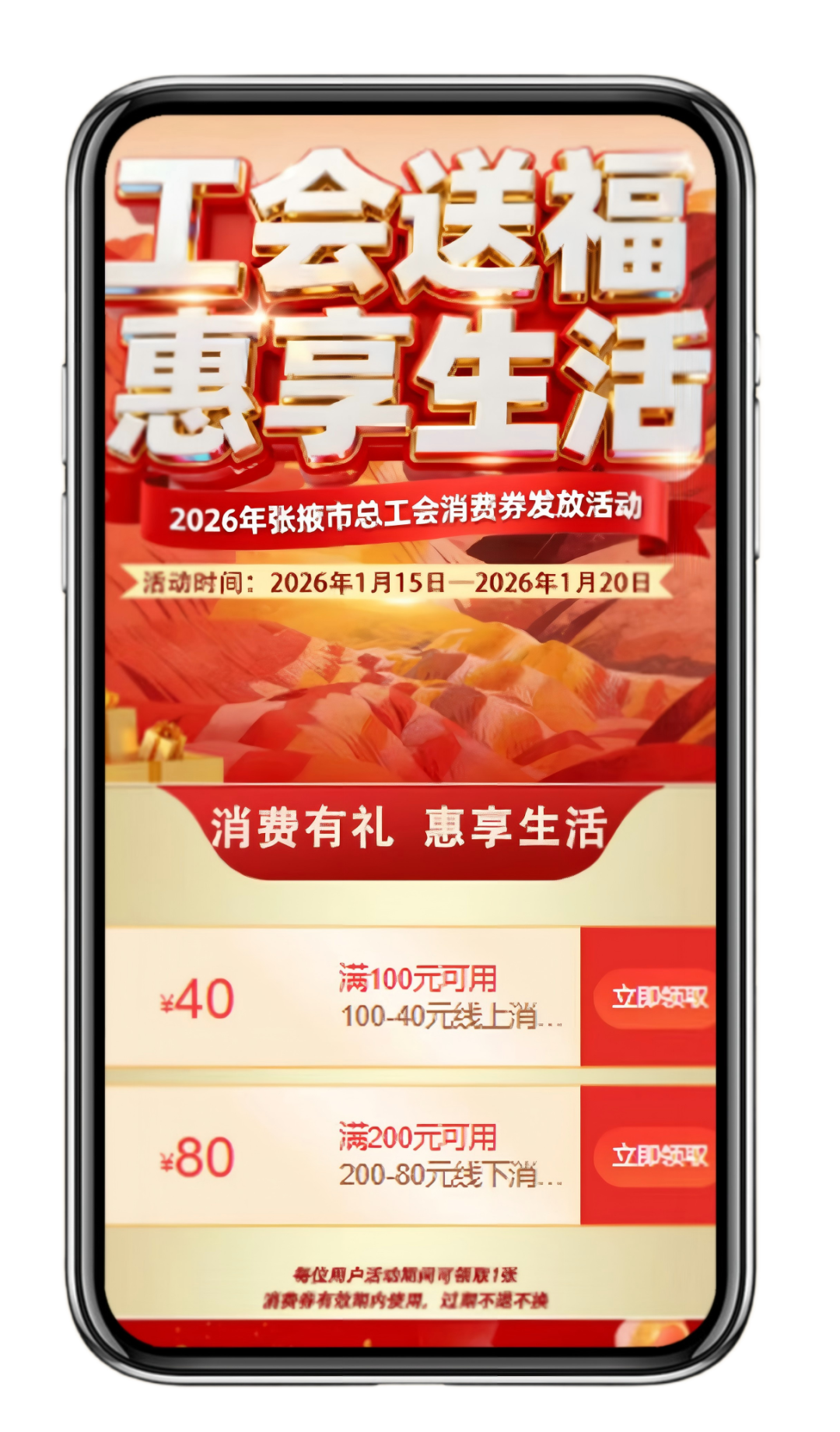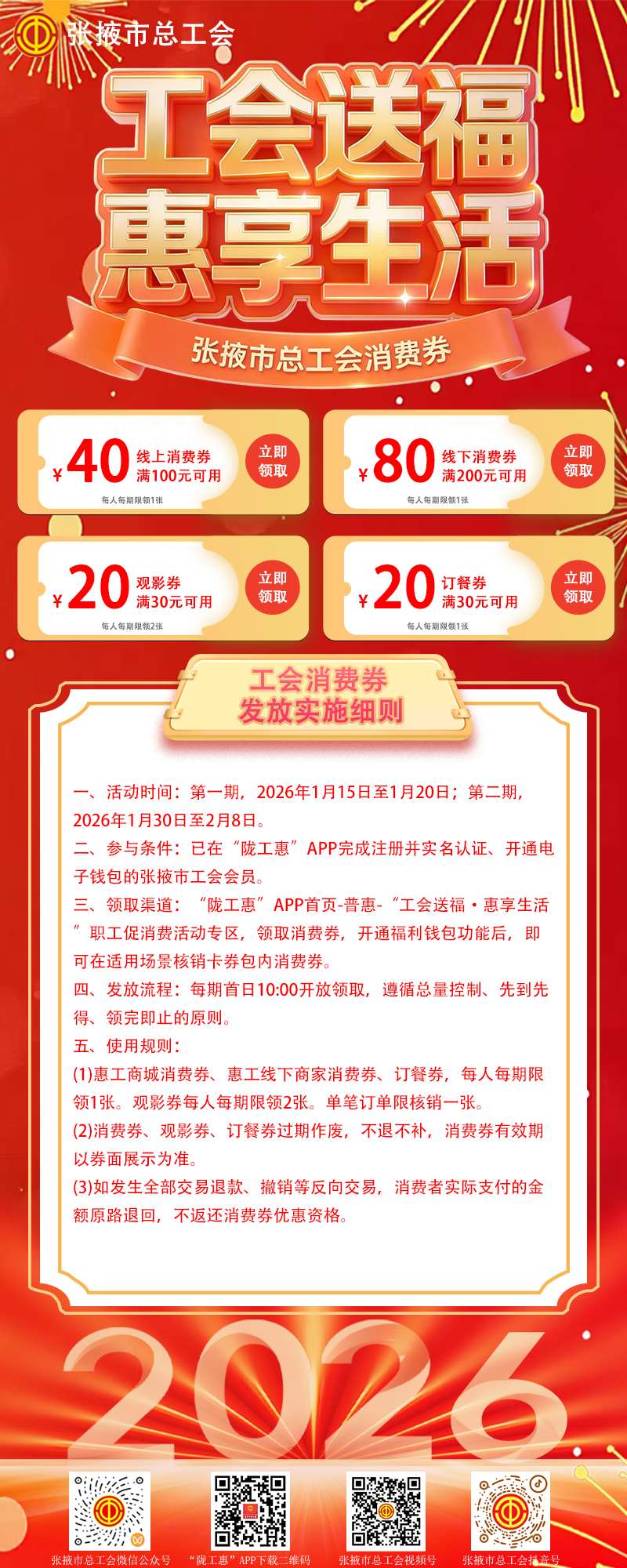 本次活动分两期,第一期将在2026年1月15日至1月20日开展,第二期在1月30日至2月8日开展。活动将为全市工会会员发放1.5万张消费券、观影券和订餐券,其中线上消费券(满100元减40元)发放3000张,每期发放1500张;线下消费券(满200元减80元)发放3000张,每期发放1500张;观影券(满30元减20元)发放6000张,每期发放3000张;订餐券(满30元减20元)发放3000张,每期发放1500张。