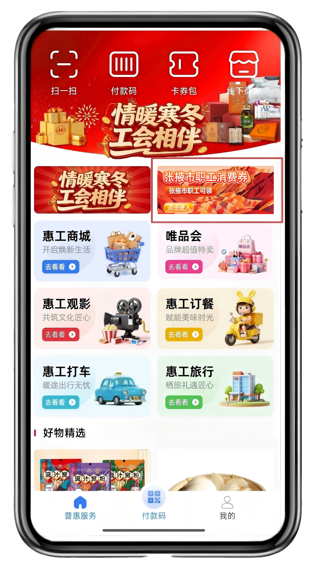 线上消费券、观影券和订餐券可直接在惠工商城(活动设“张掖本土好物专区”,请大家多支持张掖本地产品呦~)、惠工观影和惠工订餐中使用,满足消费额度支付时自动抵扣消费券。