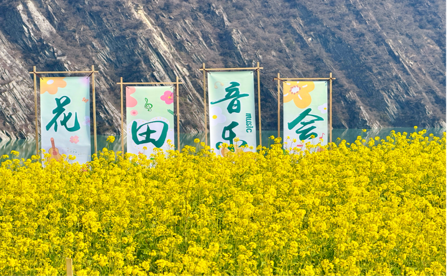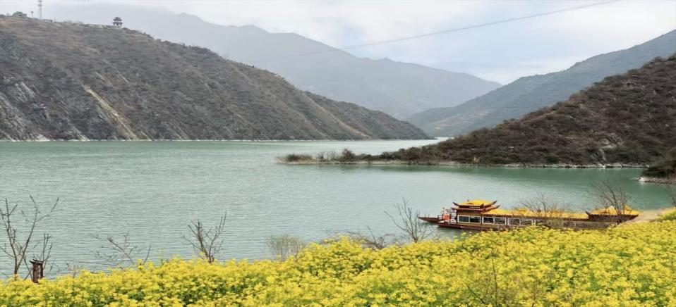 花浪从江岸直卷半山,渡口小舟在金黄与碧绿的交界处轻轻摇曳,农舍青瓦在花海中若隐若现,将蜀道沧桑都柔化成了一抹明亮的春意。