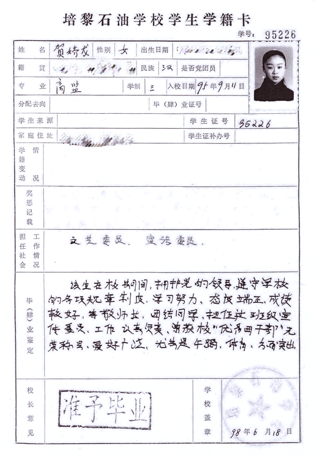 1998年夏,贺娇龙从原培黎石油学校(现兰州城市学院)毕业了。学号95226——这个印在泛黄学籍卡上的数字,至今仍静静地躺在母校的档案里,连着她永远留在这里的青春。