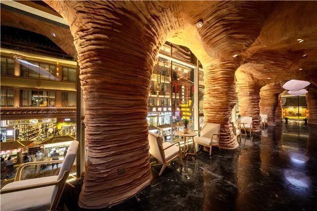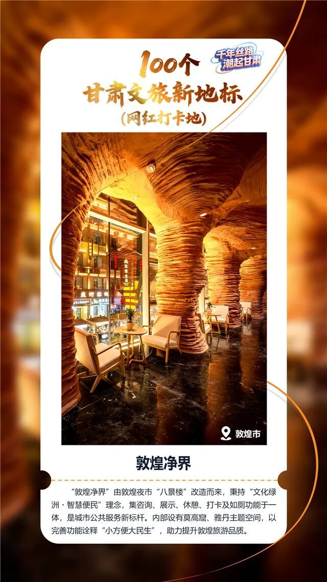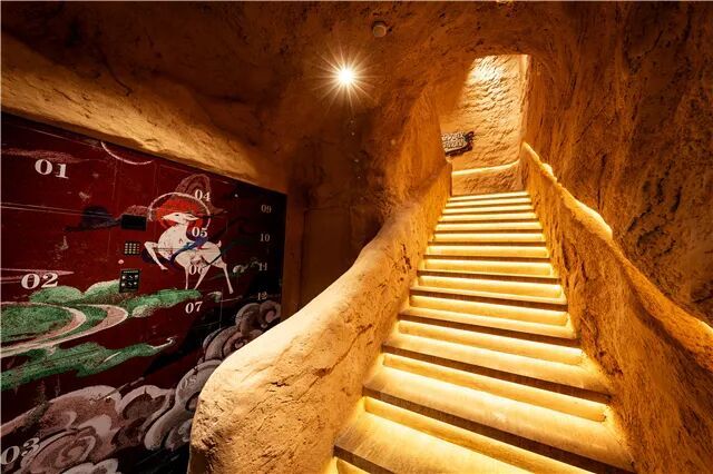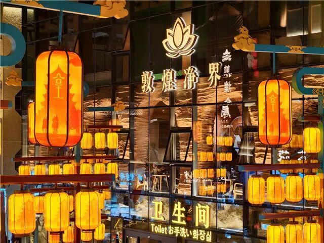 在建筑设计上,“敦煌净界”以超白玻璃幕墙作为外立面,与邻近的沙州楼形成鲜明的“古今对话”,成功打造为敦煌文化新IP。空间内部按主题分层规划,一层以“莫高至善”为核心,深度融入莫高窟文化元素,让游客在便捷服务中感受千年石窟的艺术魅力;二层以“雅丹秘境”为主题,通过特色场景营造,还原雅丹地貌的奇幻意境。