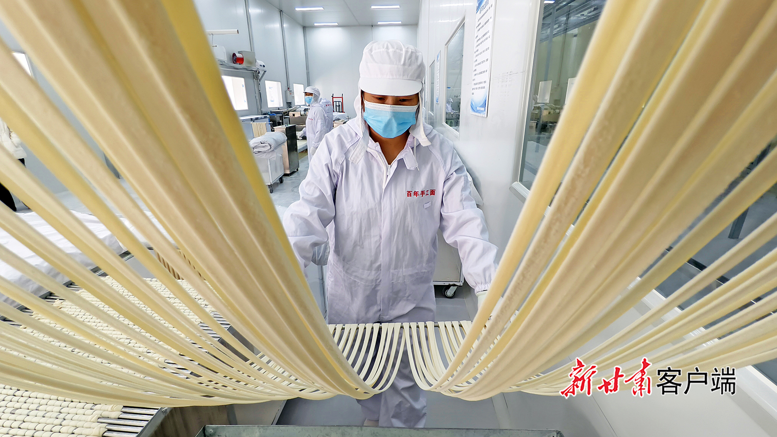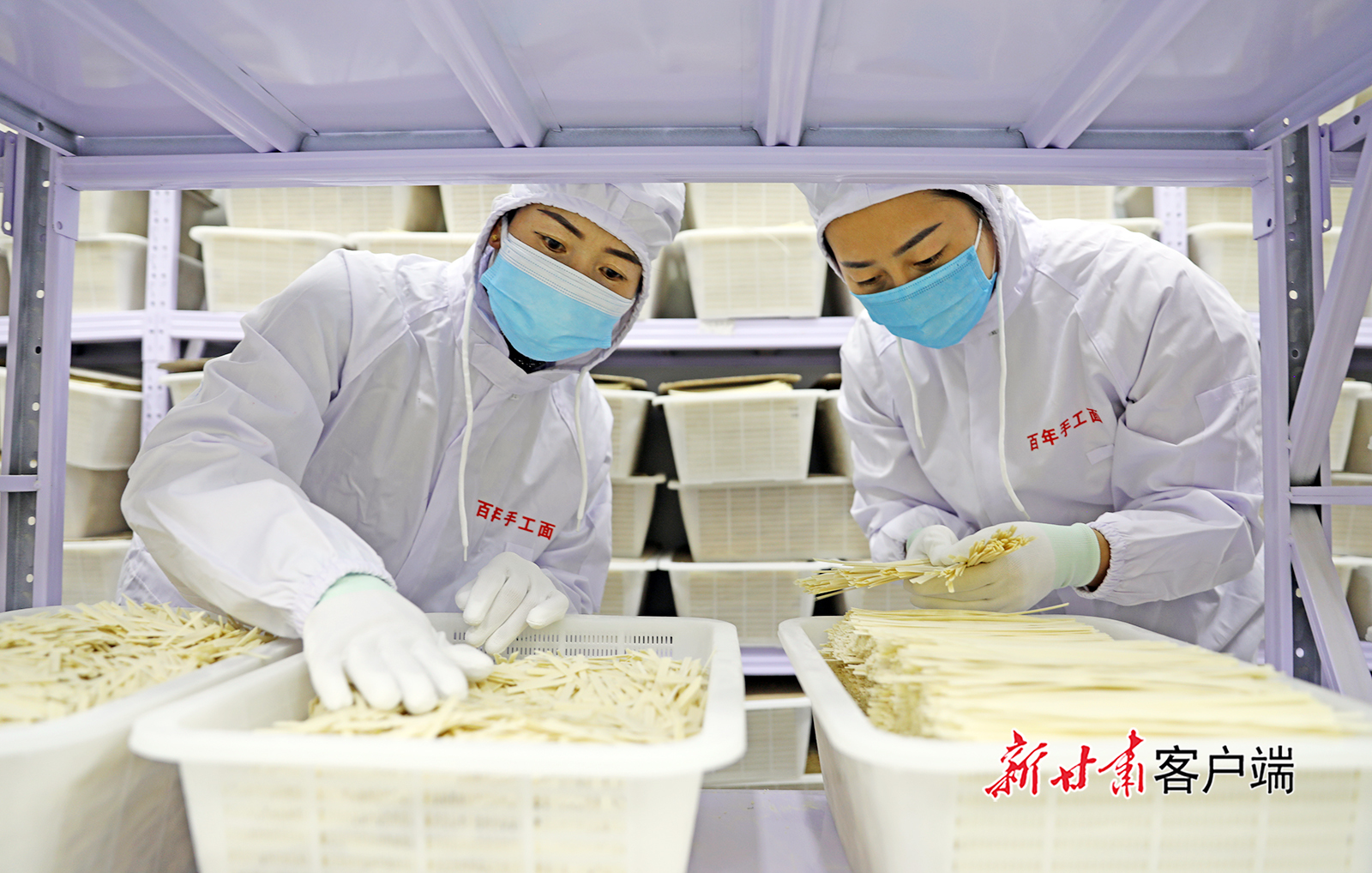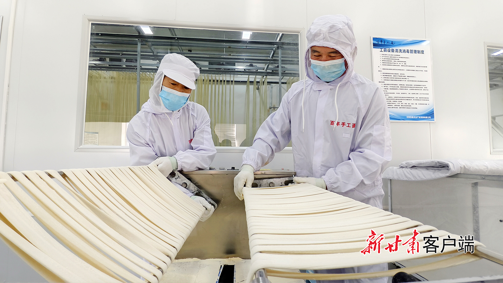 1月21日,在民乐县雪麦农业产业发展有限公司手工挂面生产车间里,工人正在紧张有序地加工、晾晒传统手工挂面。