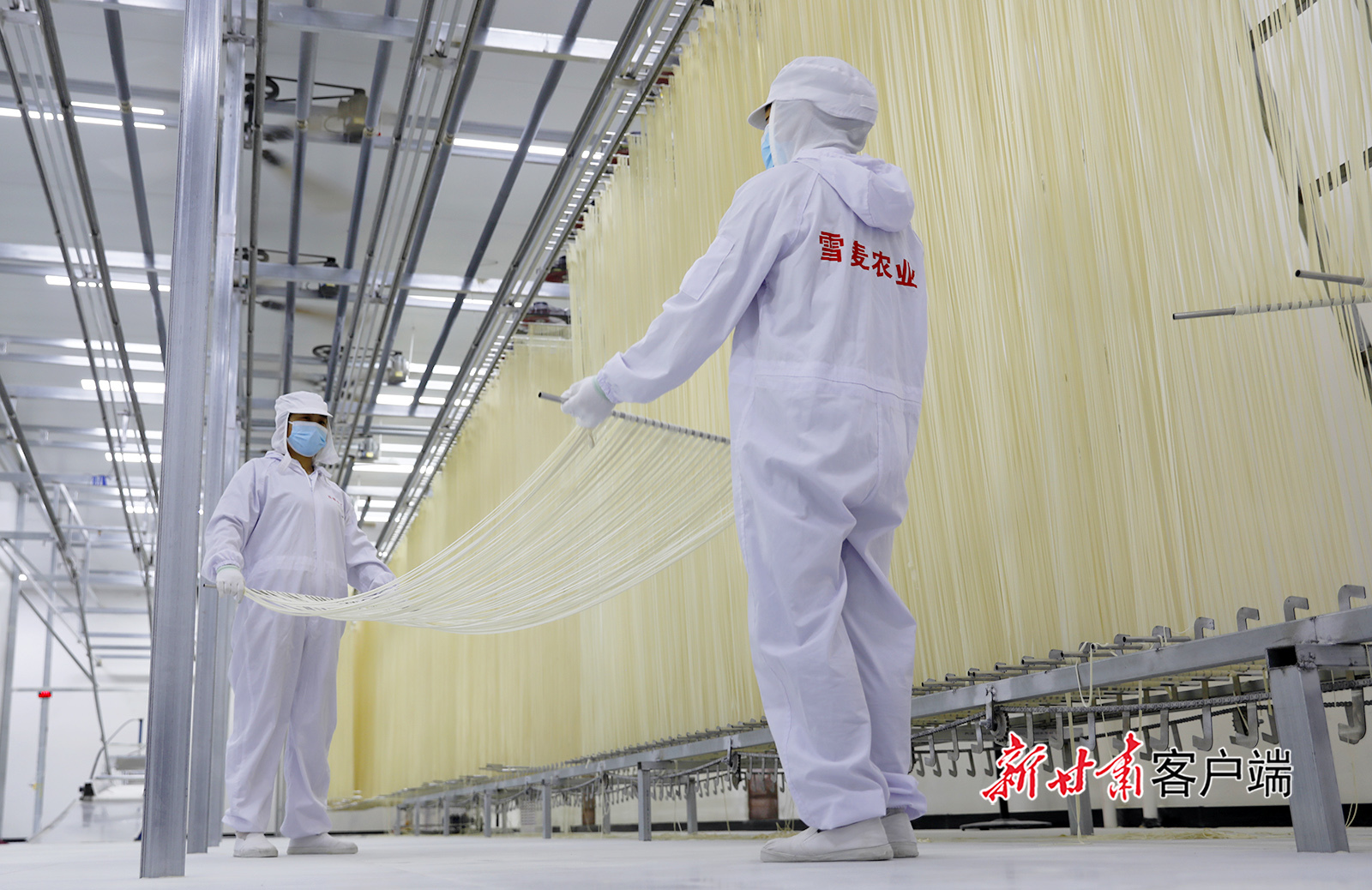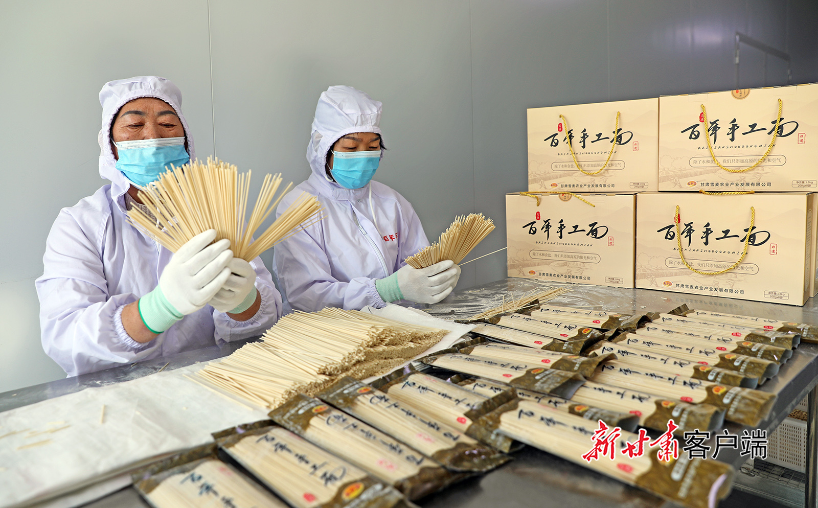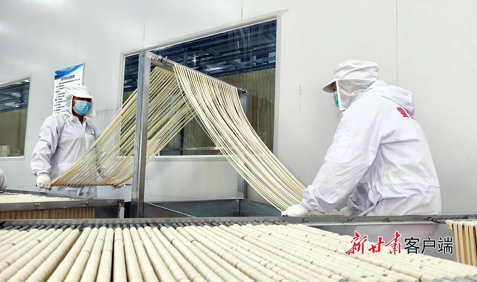 1月21日,在民乐县雪麦农业产业发展有限公司手工挂面生产车间里,工人正在紧张有序地加工、晾晒传统手工挂面。