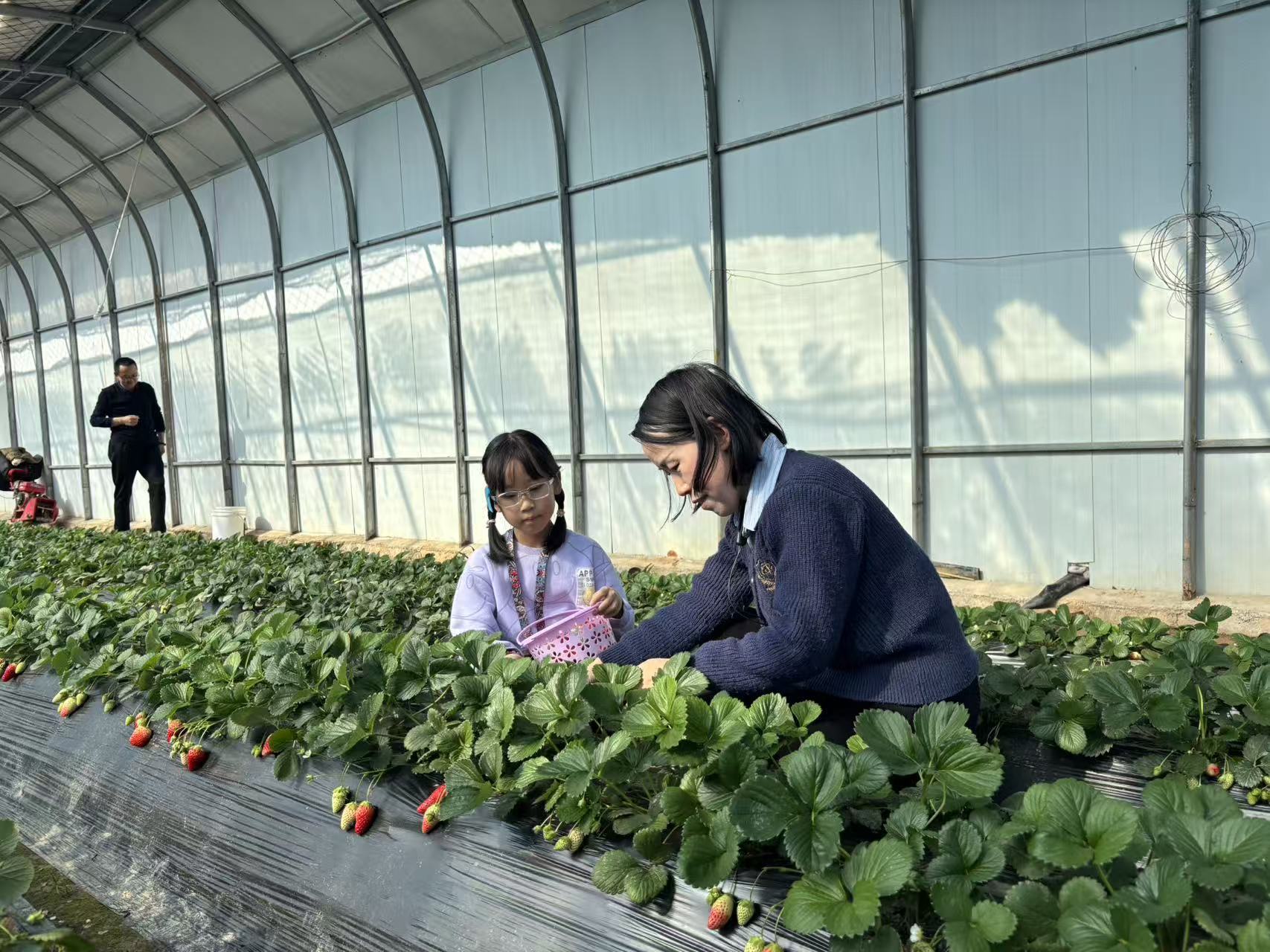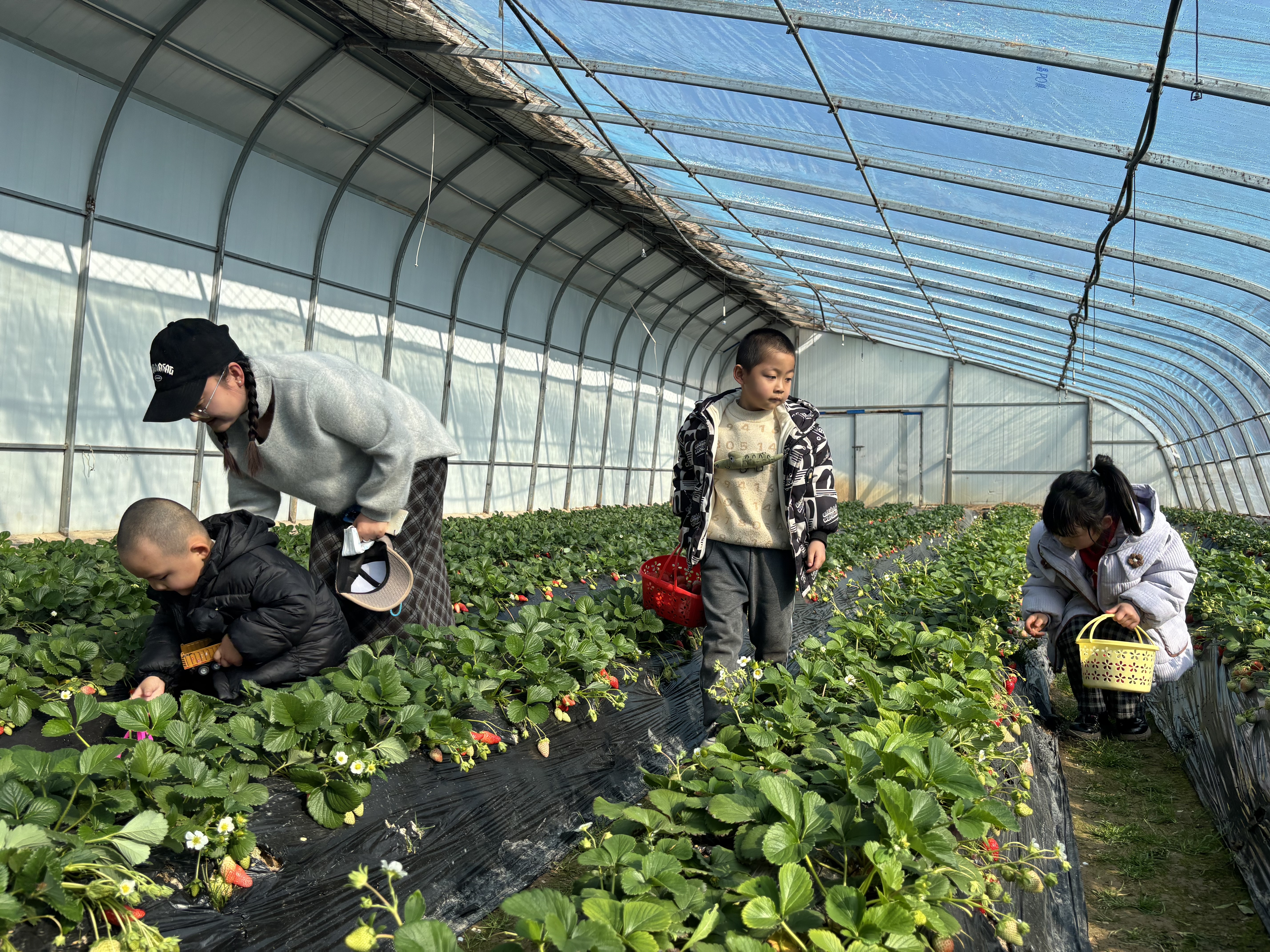 走进康家沟村草莓种植大棚,清甜果香扑面而来,瞬间驱散了冬日的寒凉。游客们提着采摘篮,穿梭在整齐的田垄间,或俯身挑选熟透的果实,或举着刚摘下的草莓拍照打卡,欢声笑语不断。