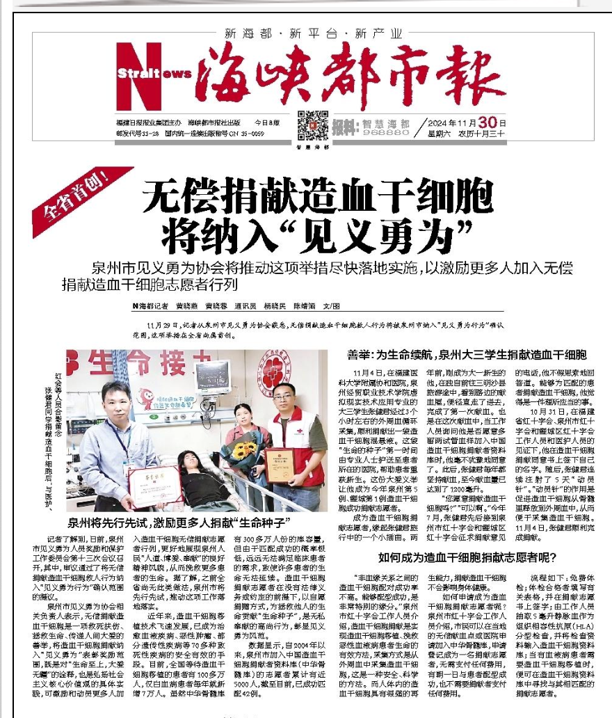 报道称,造血干细胞移植是当前挽救血液病患者的重要医治手段,器官移植是挽救器官衰竭患者的重要途径,通过志愿者无偿捐献是实现造血干细胞移植、器官移植的一条主渠道。造血干细胞捐献、器官捐献是无私奉献、挽救生命的高尚行为,折射着区域文明程度,诠释着社会爱心,对于发扬人道主义精神,拯救广大重症血液病患者、器官衰竭患者具有十分重要的意义。