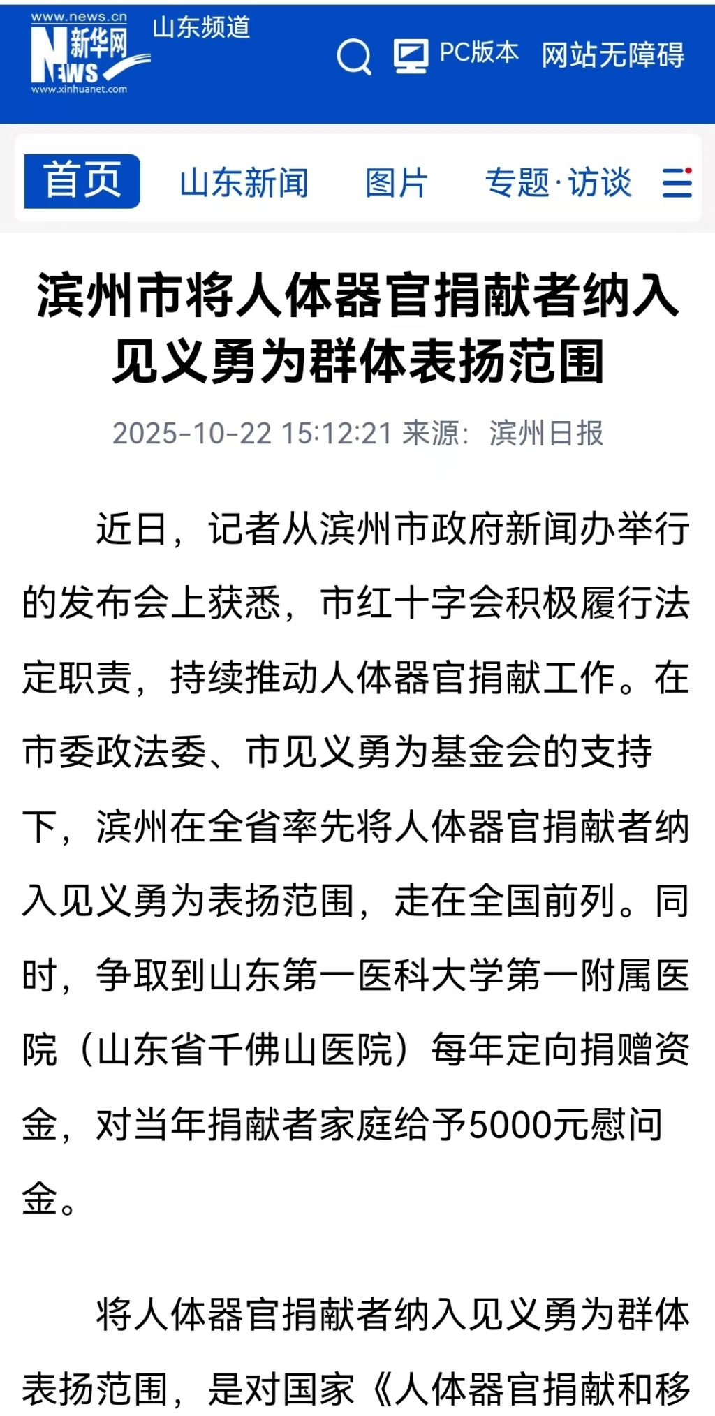 2025年10月22日《滨州日报》报道,滨州在全省率先将人体器官捐献者纳入见义勇为表彰范围。报道称,将人体器官捐献者纳入见义勇为群体表扬范围,是对国家《人体器官捐献和移植条例》的积极响应与创新落实,将无偿捐献器官的高尚行为与见义勇为精神相结合,把《条例》要求转化为具体激励措施,既为全省乃至全国人体器官捐献工作提供了“滨州样本”,也以政策创新助力公益事业发展,推动《条例》精神在滨州落地生根。