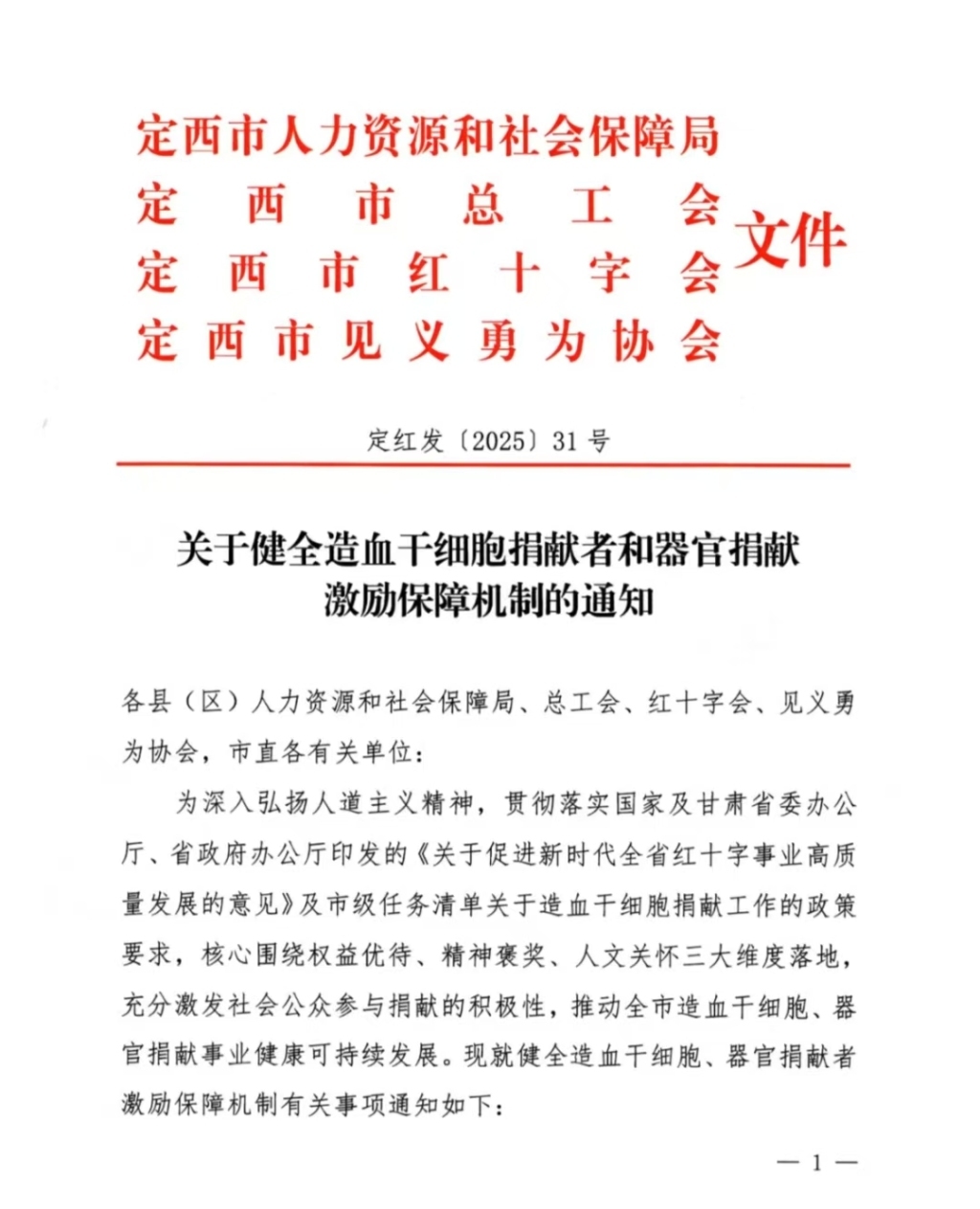据《甘肃日报》2026年1月11日报道,定西市人力资源和社会保障局、市总工会、市红十字会、市见义勇为协会近日联合印发《关于健全造血干细胞捐献者和器官捐献激励保障机制的通知》,围绕权益优待、精神褒奖、人文关怀三大维度出台举措,激发社会公众参与捐献积极性,推动全市造血干细胞、器官捐献事业健康可持续发展。