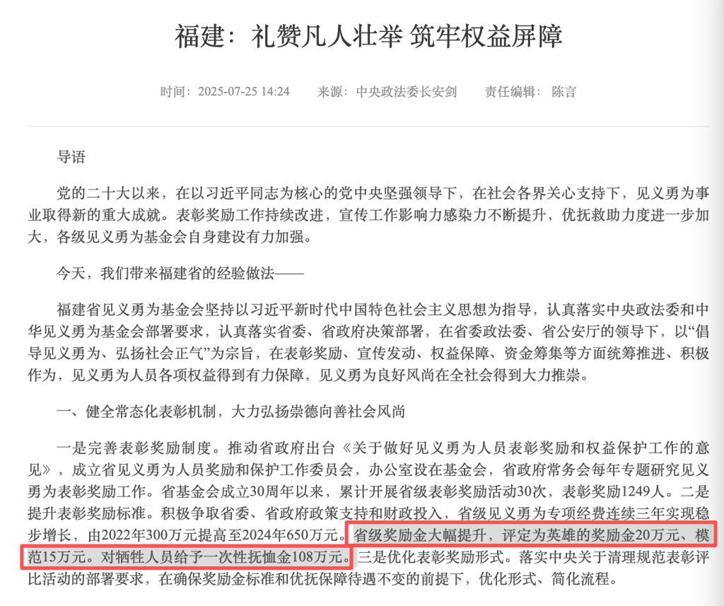我注意到,全国多地为礼赞凡人壮举,通过专项经费奖励见义勇为人员。如福建省,被评定为英雄的奖励金20万元,模范15万元,对牺牲人员给予一次性抚恤金108万元。此外,多地还在生活与医疗、子女教育、就业与住房、社会福利等方面给予见义勇为人员优待。