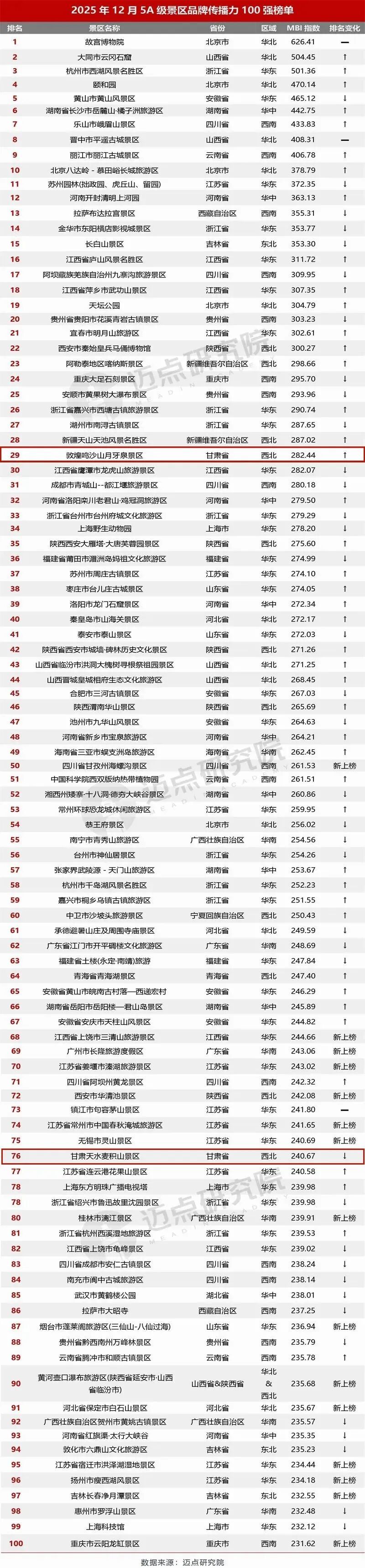 近日,迈点研究院发布了2025年12月5A级景区品牌传播力100强榜单,甘肃省共有两家5A级景区入选。在细分类型榜单中,天水麦积山景区位列“综合吸引类”全国第3名;在区域类榜单中,敦煌鸣沙山月牙泉景区位列西北地区第4名。