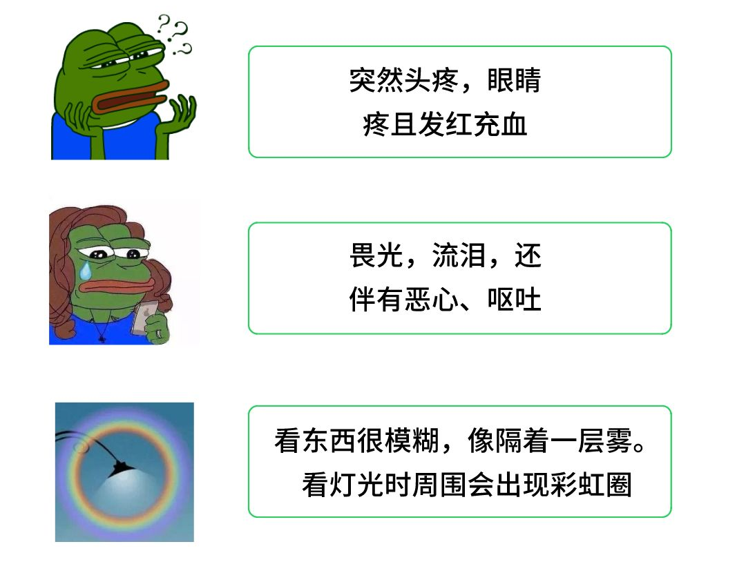 急性青光眼则以闭角性青光眼为主,发作时眼压会急速飙升,症状相对比较明显些: