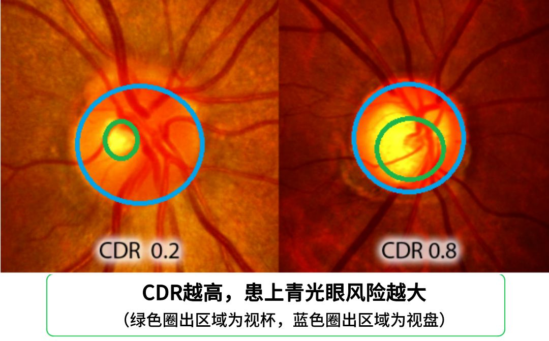 一般而言,在视野检查时,通过眼底镜、裂隙灯前置镜或眼底照相的方法,观察得到的“杯盘比”(视杯/视盘得出的数据,简称CDR)大小达到0.6即可高度可疑为青光眼。