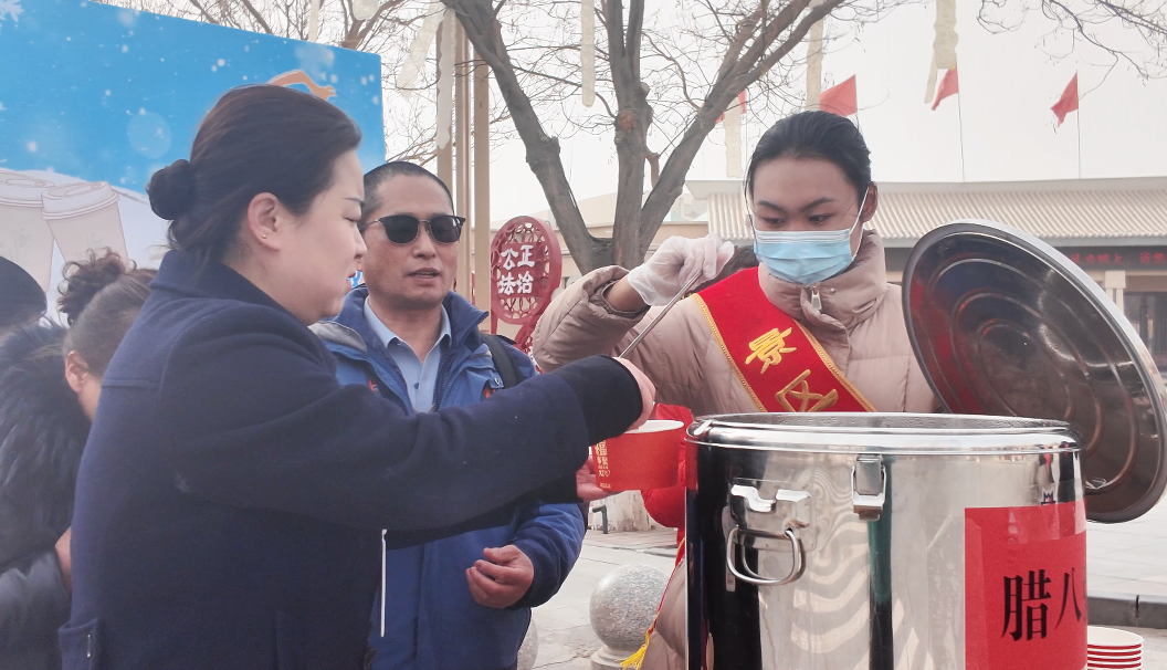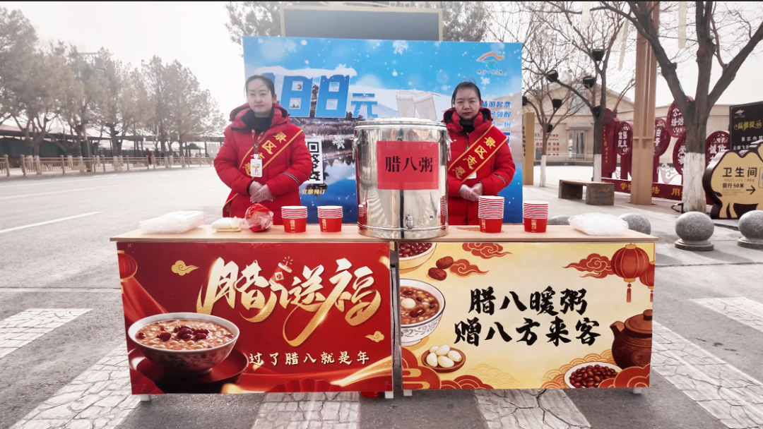 工作人员将精心熬制的腊八粥分装成碗,热情地递给过往的市民与游客。一句句“腊八安康”的问候混着粥香,在空旷的大漠里格外暖心,驱散了冬日的寒冷。