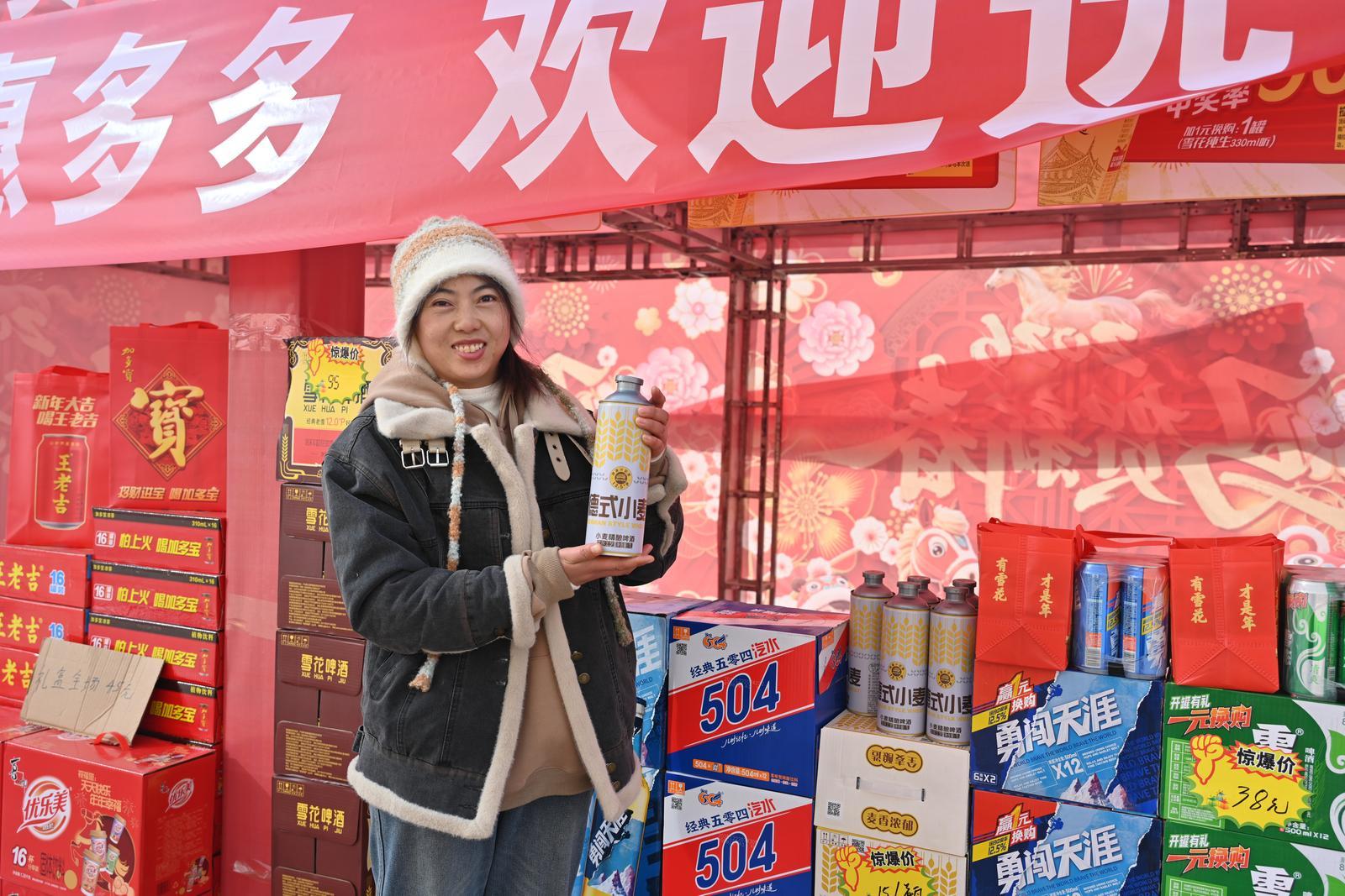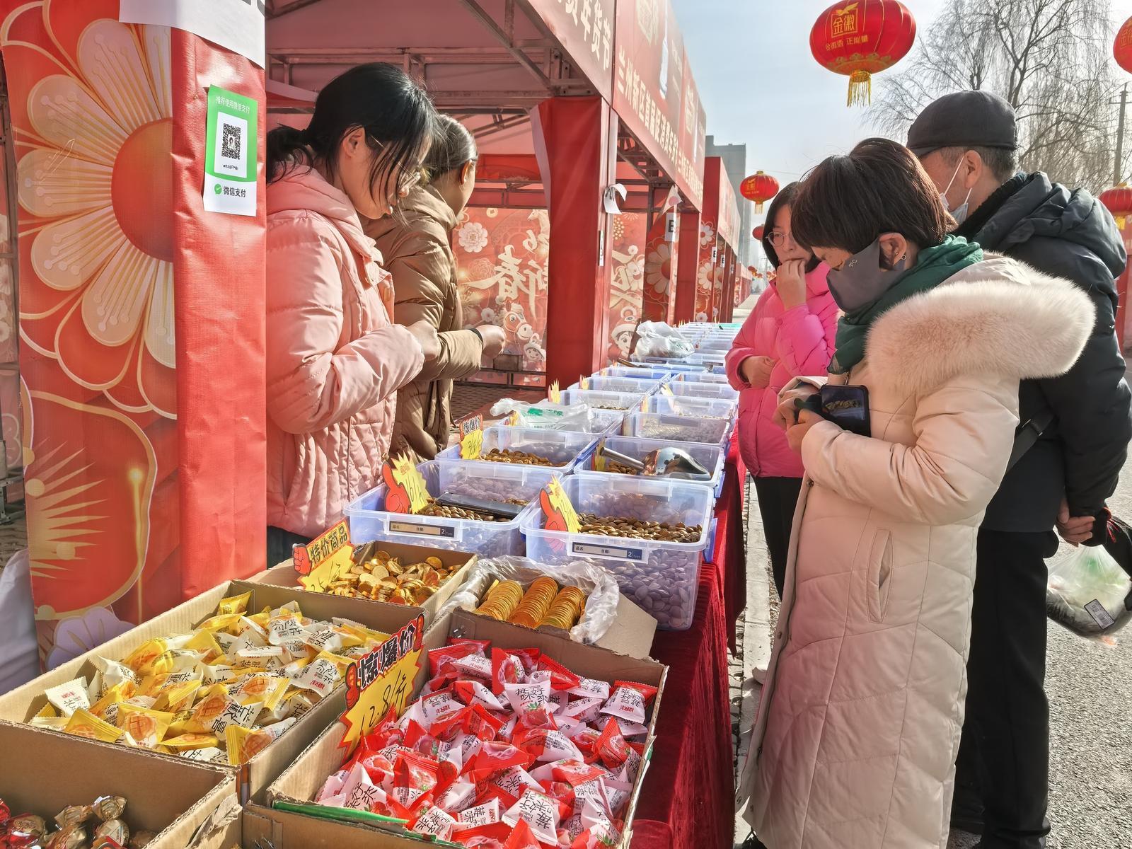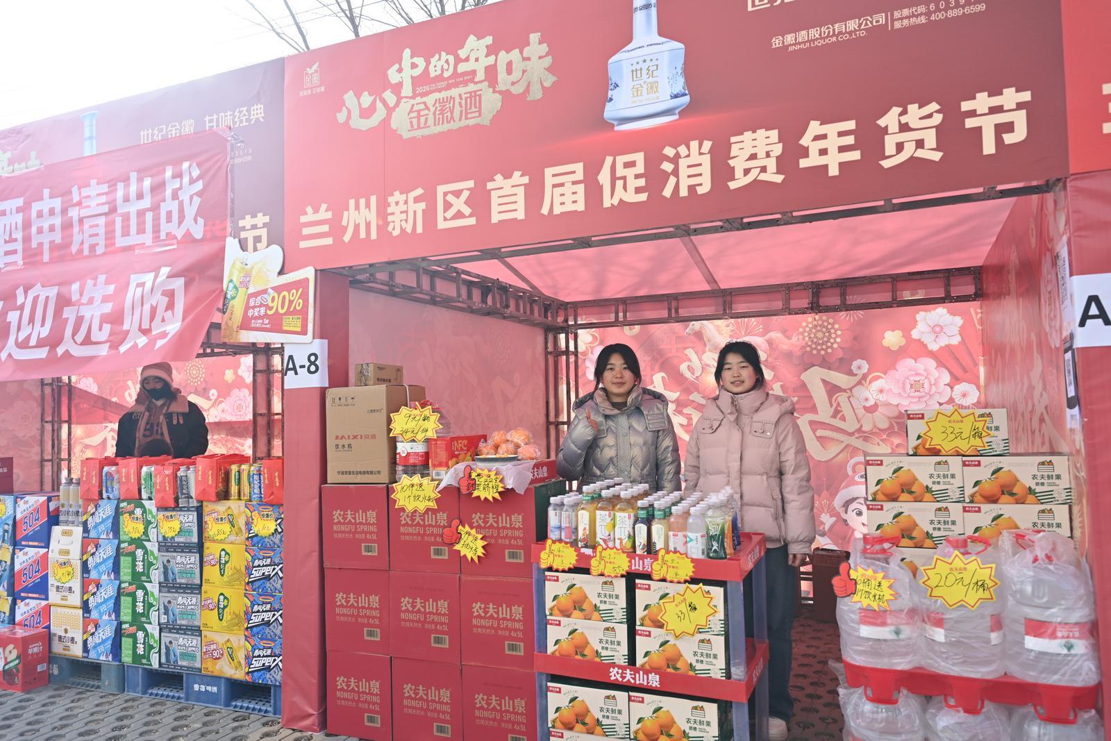 展区内,新区鸿湖商贸有限公司展销农夫系列饮料和鲜果脐橙,兰州三毛展销十余种三毛派神服饰,中川镇廖家槽村展销自产面粉、菜籽油、胡麻油,西岔镇展销各村自产的长寿面、面粉、农家土鸡蛋、胡麻油……各具特色的“新区味道”吸引了过往群众不时前来咨询。A8-9的商户说:“我们特意推出了优惠活动,雪花系列买5箱送一件504的饮料,过年礼盒全场45元,欢迎大家来囤年货!”