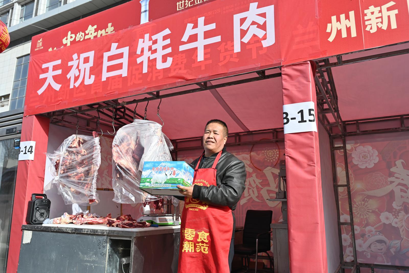B区14号,来自天祝县的齐老板在这里展销自家的白牦牛肉。看到记者过来,齐老板连忙介绍,由于海拔、气候、草原等天然优势,天祝的白牦牛肉高蛋白、低脂肪、纯天然,是天祝响当当的品牌。“新区的家人们,我家的白牦牛肉,定点屠宰定点检疫,食品安全没问题。放心买!快来买!”齐老板说。