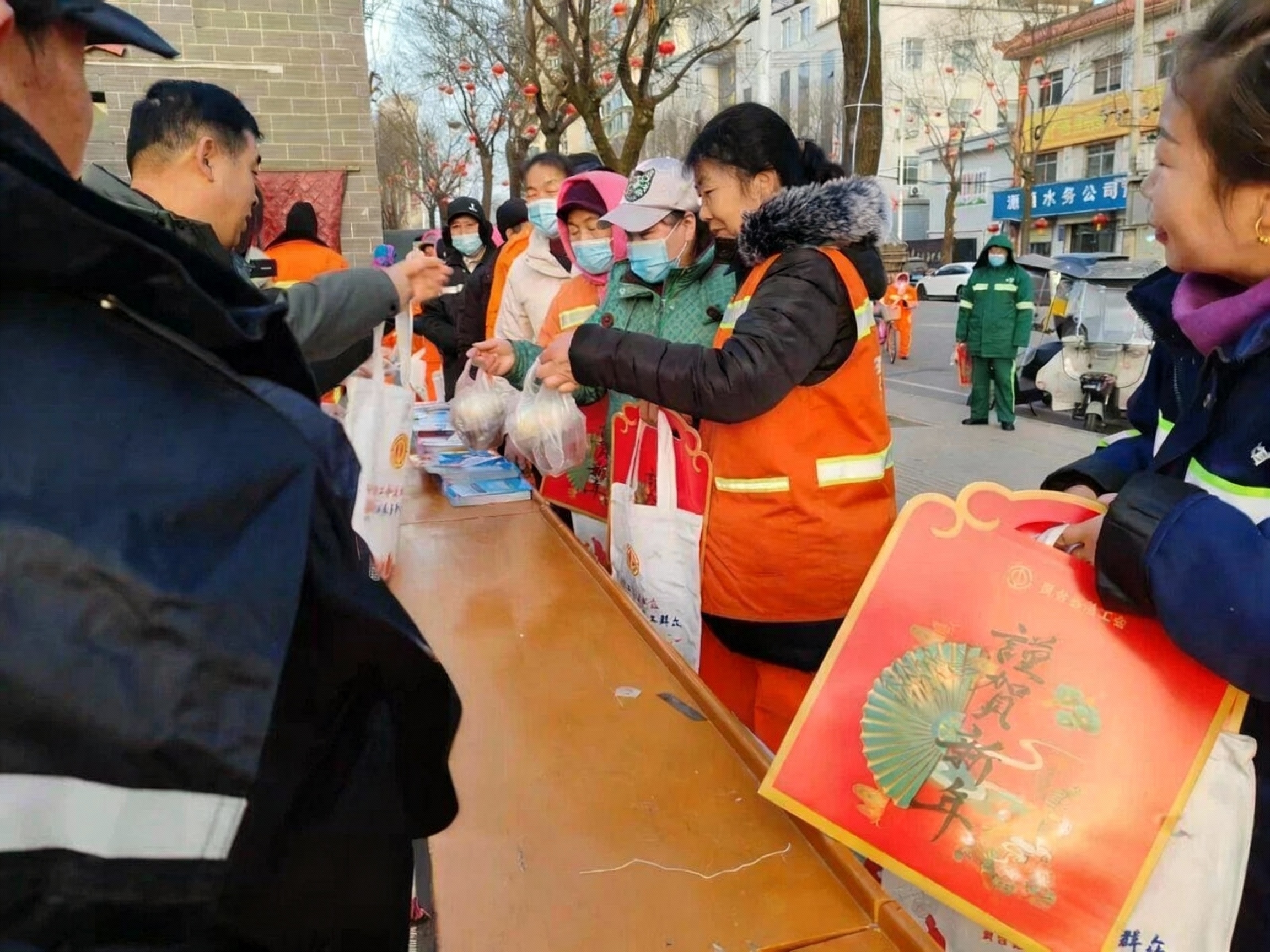 活动现场,红色宣传横幅与红彤彤的“福”字相映成趣,精心熬制的腊八粥冒着腾腾热气,香甜气息弥漫在驿站周边。身着橙色、蓝色工装的环卫工人,佩戴头盔的外卖骑手等户外劳动者陆续抵达,在志愿者的引导下有序排队,领取温热的腊八粥与包子。大家手中接过的,不仅是可口的节日食品,更是满载祝福的“福”字、春联与窗花,脸上的笑容驱散了冬日的疲惫。