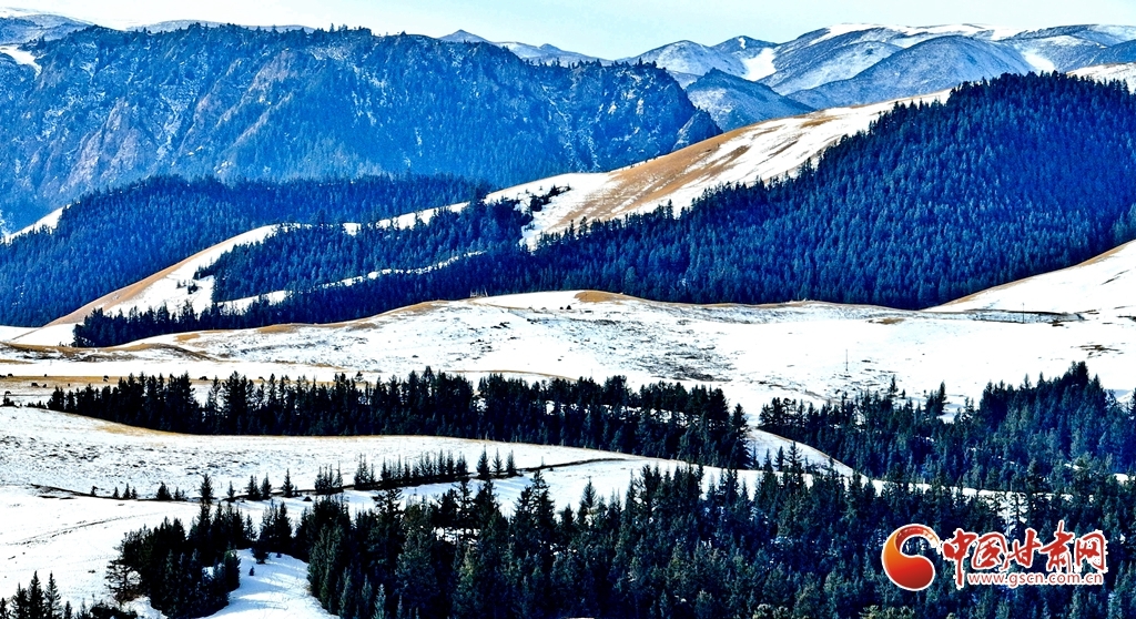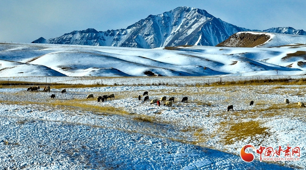 1月24日雪后初霁,肃南裕固族自治县境内的祁连山银装素裹,云雾缭绕。雪山、峡谷、森林、草原在皑皑白雪中交相辉映,冬意盎然。牛群、马群与羊羔在雪中草原上静静的觅食,勾勒出一幅人与自然和谐共生的壮美画卷。