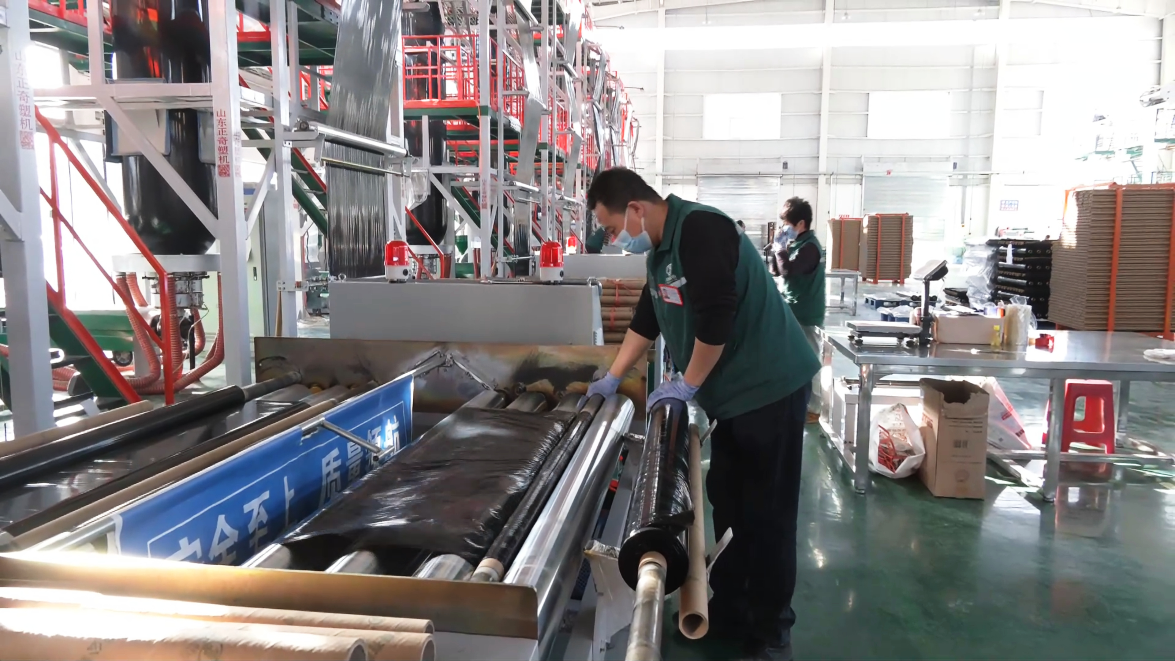 近日,记者在泾川县工业集中区西园区的甘肃中辉利拓科技发展有限公司生产车间看到,占地3200平方米的厂房内生产井然有序,多条高效能全自动化生产线高速运转,生物可降解农用地膜不断产出,工人们正熟练地进行卸卷、包装等工序。