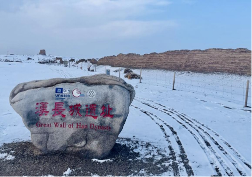 北眺玉门关,小方盘城的夯土城墙在冰雪中巍然屹立,与蜿蜒起伏的汉长城共同勾勒出一幅苍茫壮阔的画卷。“简牍玉门关” 体验成为文化打卡新地标。游客临摹出土汉简上的戍边文书,指尖拂过的不仅是千年历史的行政印记,更能通过品味复刻的汉代美食,让“大漠孤烟映残垣” 的诗意增添了独特的味觉层次。更有银装素裹的河仓城遗址,墙体中交错的红柳枝宛如“古代钢筋”,无声诉说着汉代 “因地形用险制塞” 的建筑智慧,也让考古爱好者得以近距离解读《汉书》中 “敦煌,其郡仓粟衍” 的历史记载。