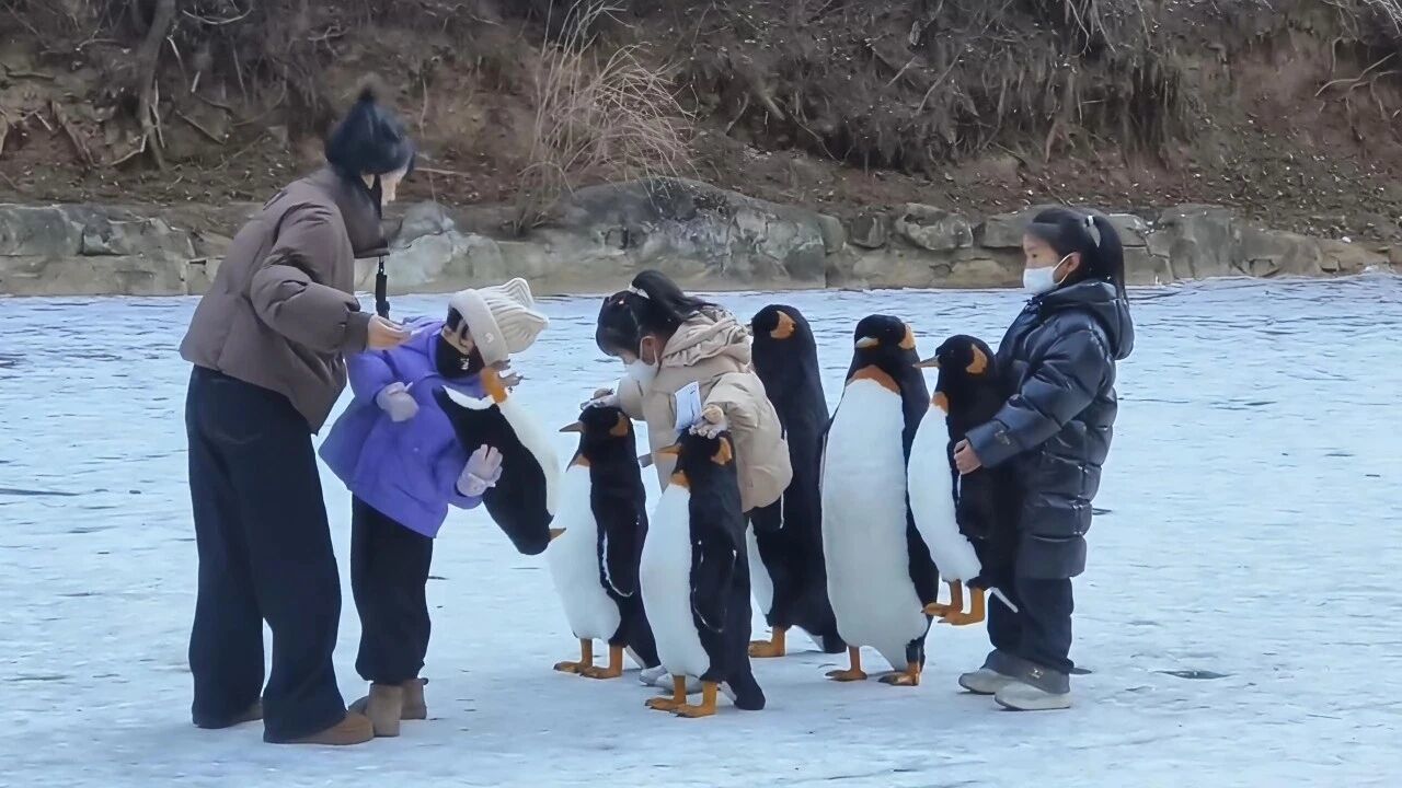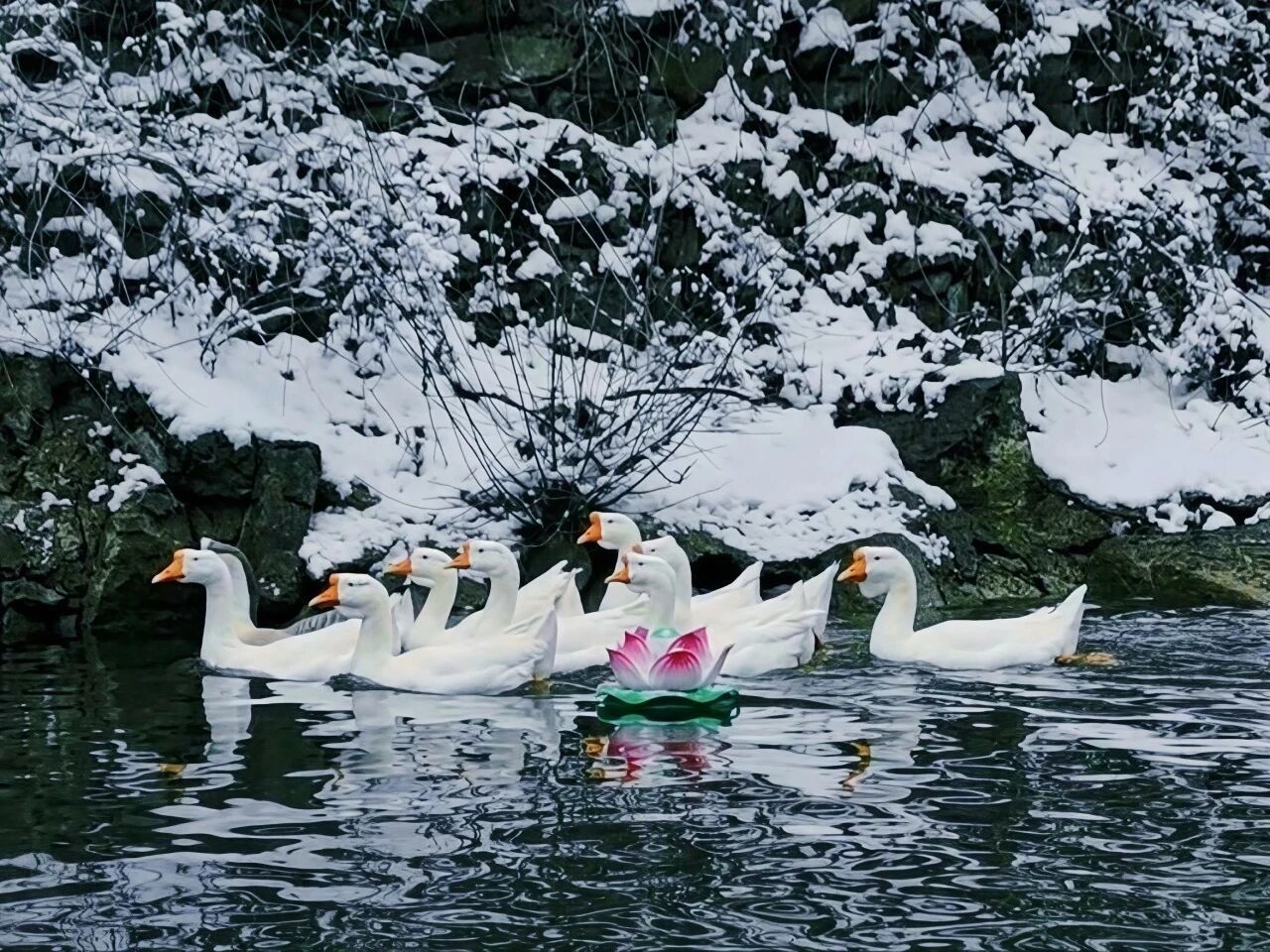 步道两侧,雾凇冰挂千姿百态,与色彩点缀的人造花卉相映成趣,构筑出如梦似幻的冰雪园林;芙蓉潭天然冰面经专业加固后,成为游客嬉戏的露天冰场,几只白鹅悠然游弋其间,为洁白天地增添了几分灵动暖意。夜幕降临后,灯光与冰景交相辉映,“冰中有景,景中有光”的绚丽画面,让景区成为网红打卡的热门地标,憨态可掬的企鹅、威风凛凛的北极熊等冰雕作品前,总能看到游客驻足拍照的身影,童声笑语回荡在冰雪天地间。