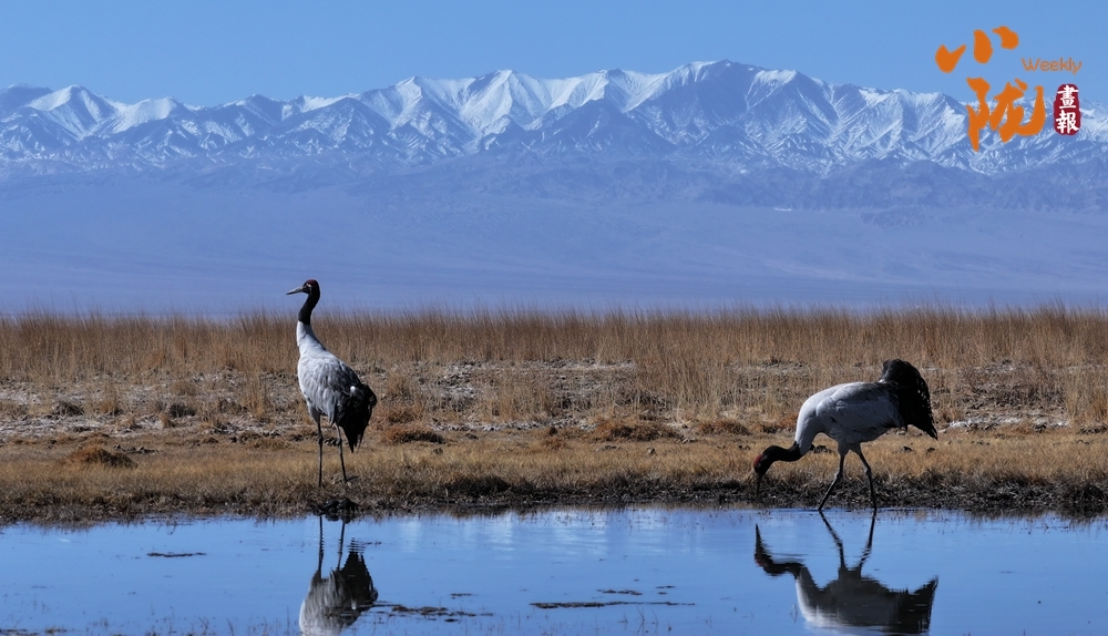 远处,阿尔金山巍峨的峰峦白雪皑皑,宛如一条腾飞的银色巨龙横卧天际。近处,宁静的湖水边,几只黑颈鹤正优雅地踱步觅食,长颈时而低垂,时而扬起,为这片冰雪映照的天地注入了一份灵动的暖意。