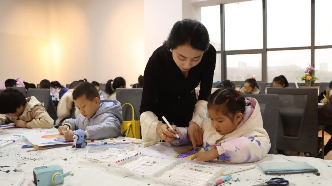 “老师,我画的山颜色都混在一起了,怎么办呀?”8岁的吴紫涵握着画笔向老师求助,记者凑近一看,她的画纸上深色叠加,颜色过于相近。老师立刻走到她身边,拿起彩笔帮她选色、耐心讲解:“你看,现在每一层都是深色,给它加点浅色过渡,这样分层就很明显啦。”在老师的指导下,吴紫涵重新拿起画笔修改,随后笑嘻嘻地对记者说道:“我喜欢看动画片,所以喜欢画画,这样就可以把我喜欢的动漫人物画下来了。”
