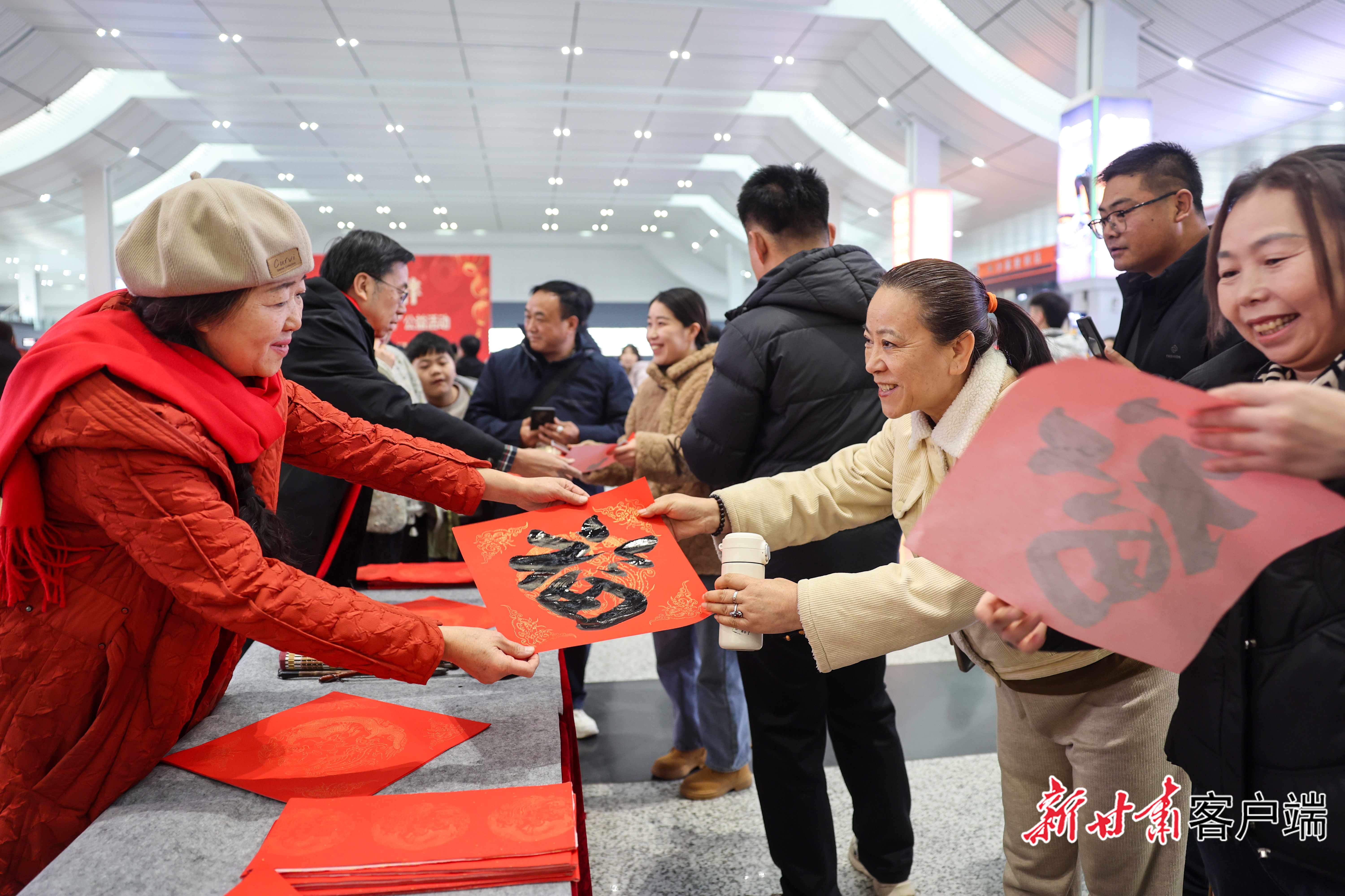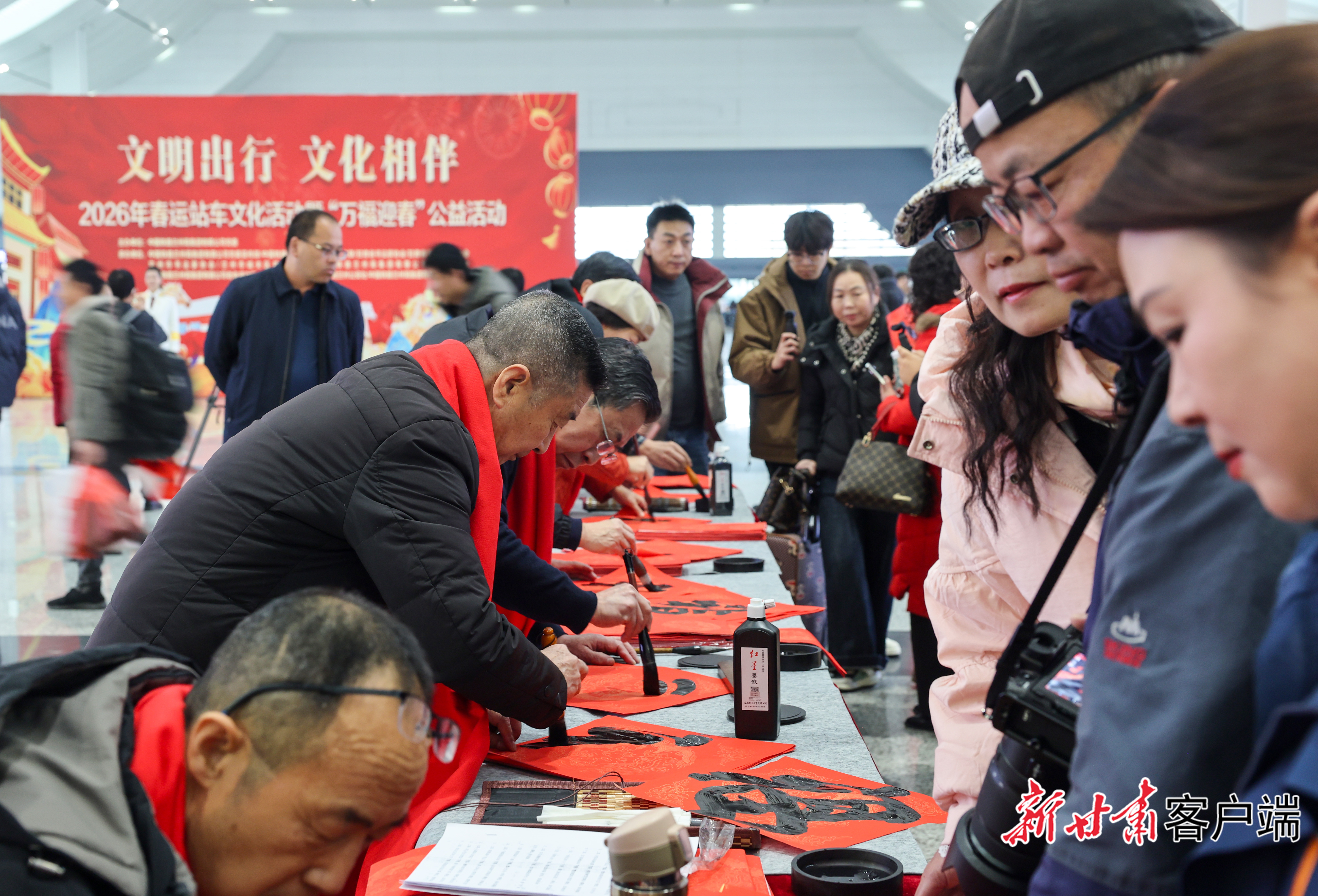 在兰州西站候车大厅内,书法、篆刻爱好者现场创作春联、“福”字、小挂轴、篆刻等作品赠送给旅客,同步开展文明服务礼仪展示、文明出行倡议诵读、签名承诺活动,引导旅客文明出行。