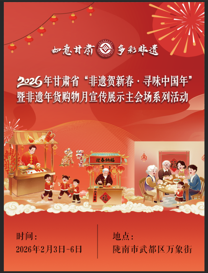 岁序更替,华章日新;非遗醒春,年味正浓。2026年2月3日至6日,由甘肃省文化和旅游厅、陇南市人民政府共同主办的“非遗贺新春·寻味中国年”暨非遗宣传展示主会场系列活动将在陇南市武都区万象街盛大启幕。我们诚邀您走进这条充满传统温情与现代欢腾的街巷,共赏非遗之美,共品陇原之味,在展演、市集、灯影与欢笑中,寻回记忆里那个鲜活、温暖、热闹的中国年。