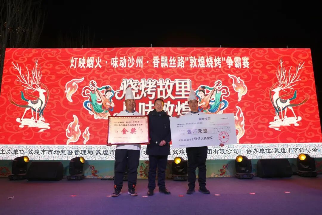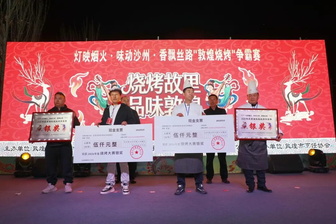 闭幕式上,为2026年首届“敦煌烧烤”争霸赛获奖商户颁发了奖牌和奖金。敦煌市戈弟烧烤店荣获金奖;敦煌市中旺烧烤店、敦煌市阿里巴巴烧烤店荣获银奖;敦晟楼老张烤羊排总店、敦煌市马哥烤羊排店、敦煌瑞龙祥雲食府农家院荣获铜奖。此外,敦煌市西域老羊倌餐饮店、敦煌市吾拉手抓饭餐饮店、敦煌市康记烧烤餐厅等14家商户获评首届“敦煌烧烤”争霸赛推荐商户,另有21家商户获得首届“敦煌烧烤”争霸赛支持商户称号。