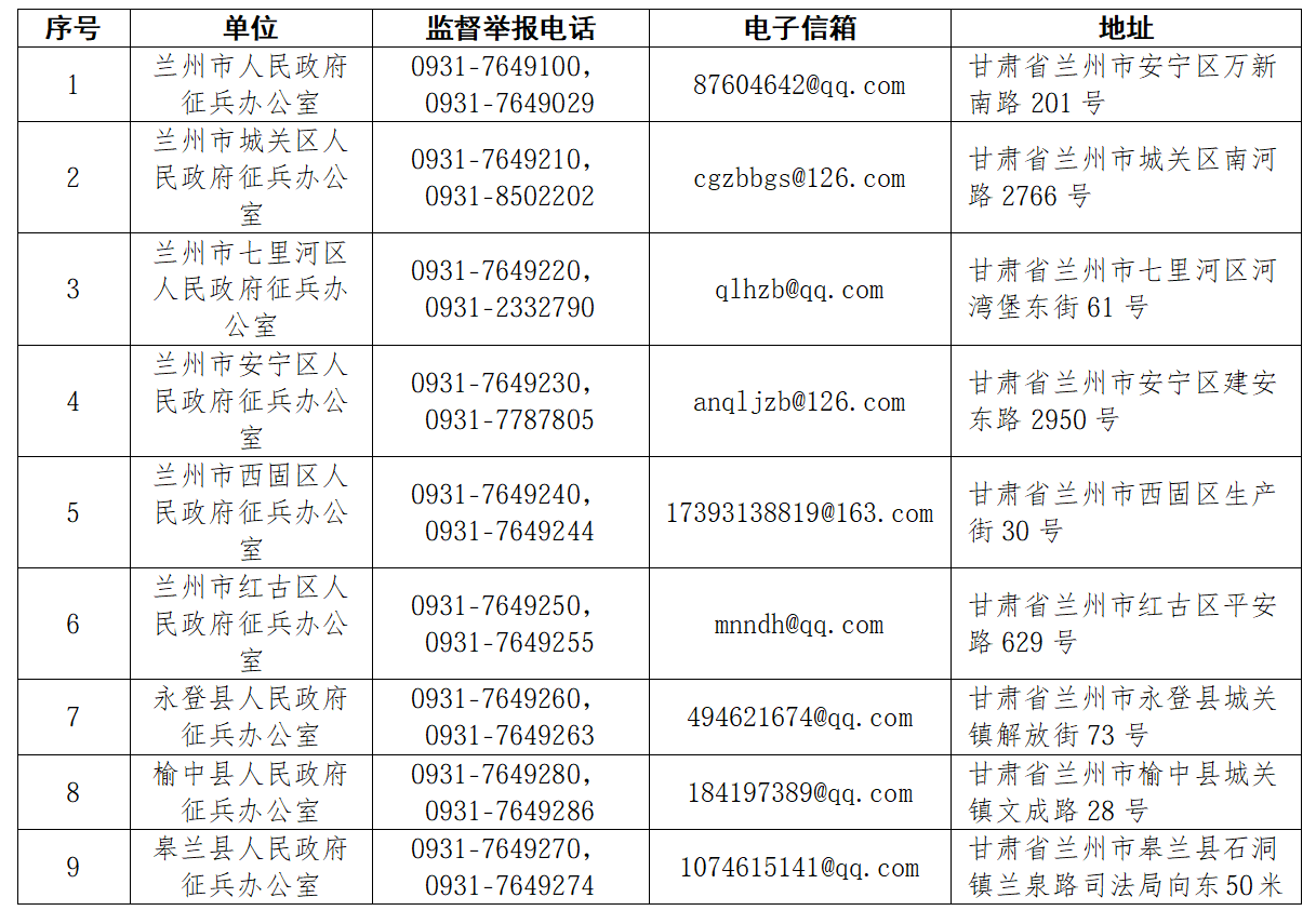 兰州市廉洁征兵监督举报电话、邮箱、地址