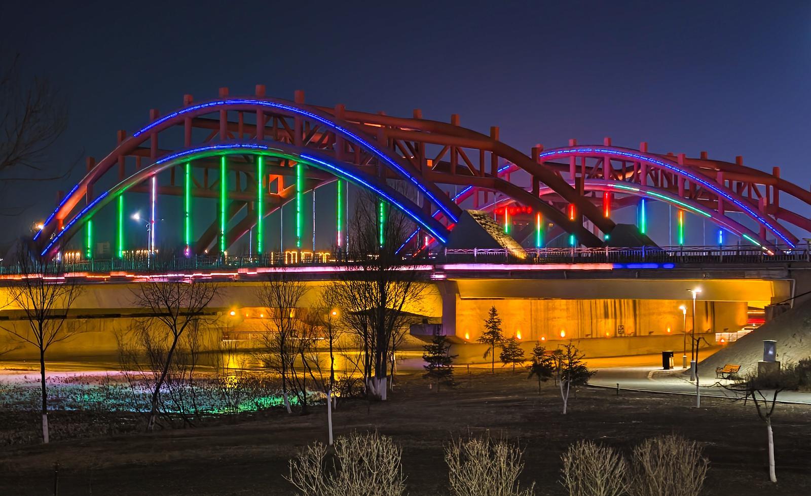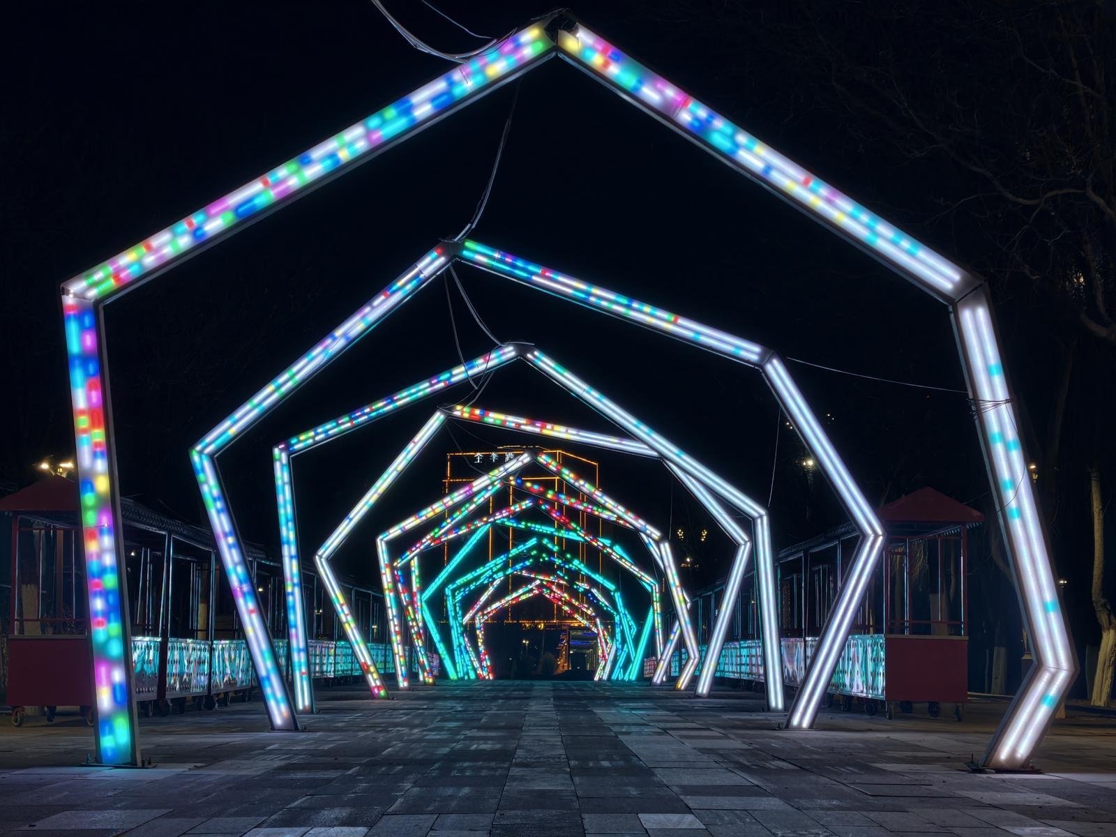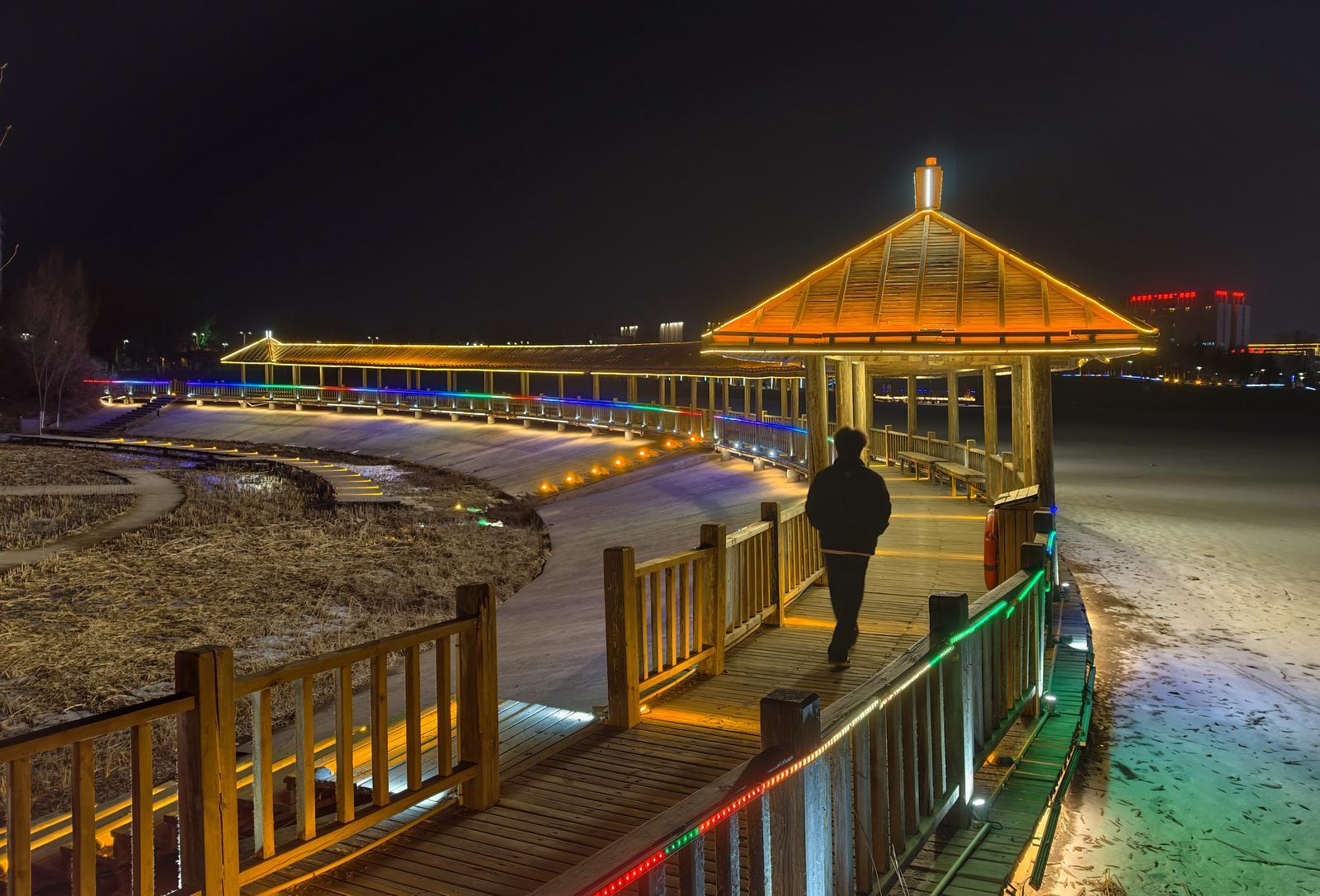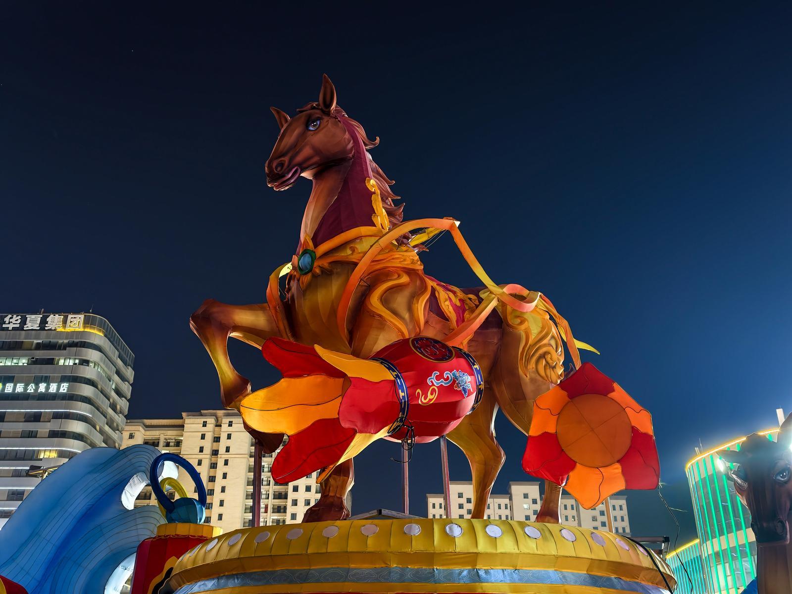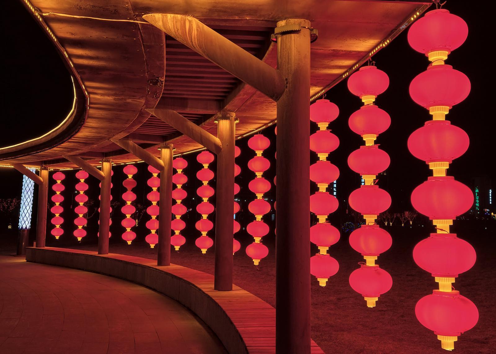 栖霞湖广场、体育公园等公共空间也被装扮一新。景观灯、投光灯与红色灯笼点缀在步道、廊架之间,玫瑰花墙、马年主题灯组更添温馨与浪漫,营造出独具风格的夜间光影效果。此外,围绕彩虹城人行天桥,对桥体、桥墩、护栏等构件开展亮化装饰,通过安装洗墙灯、线条灯、点光源灯带的动态组合,化身夜间绚丽多彩、动感十足的光影画卷。