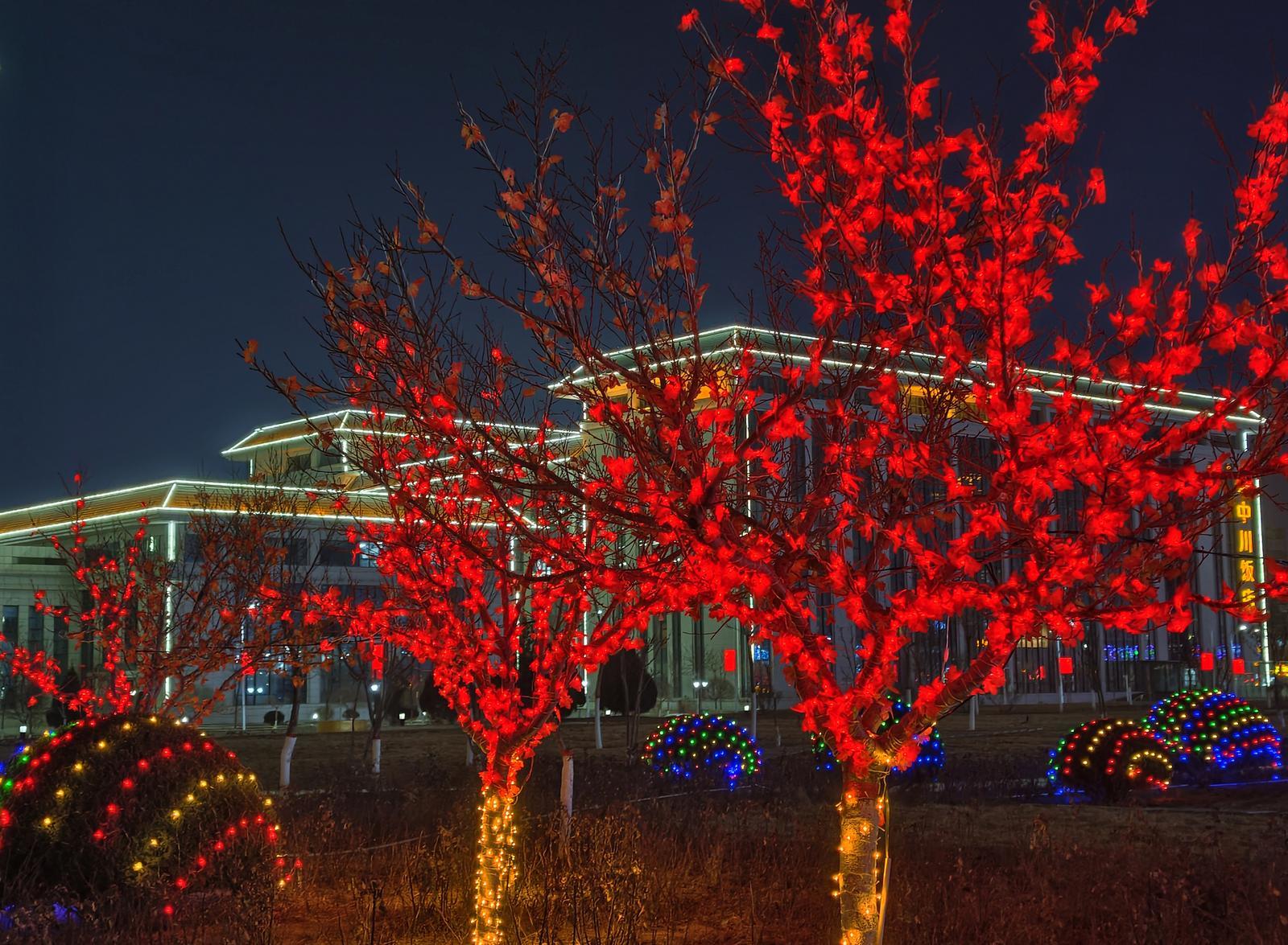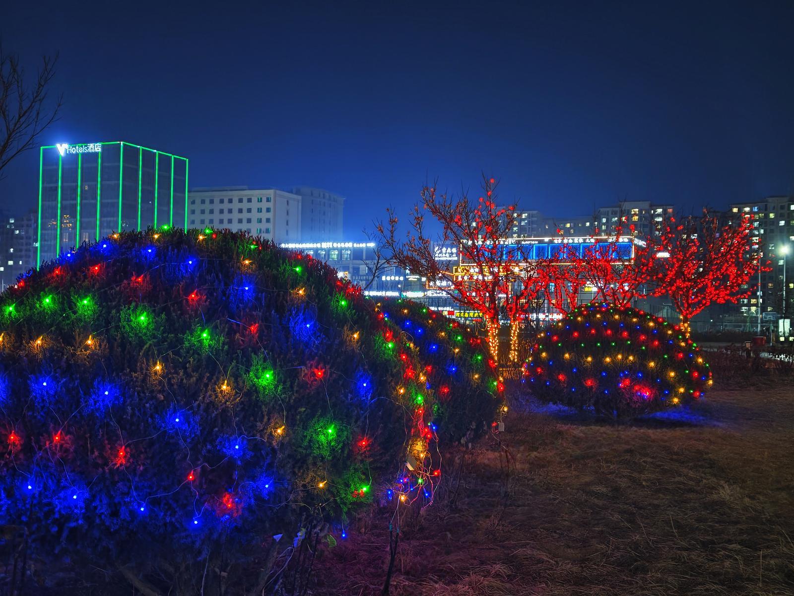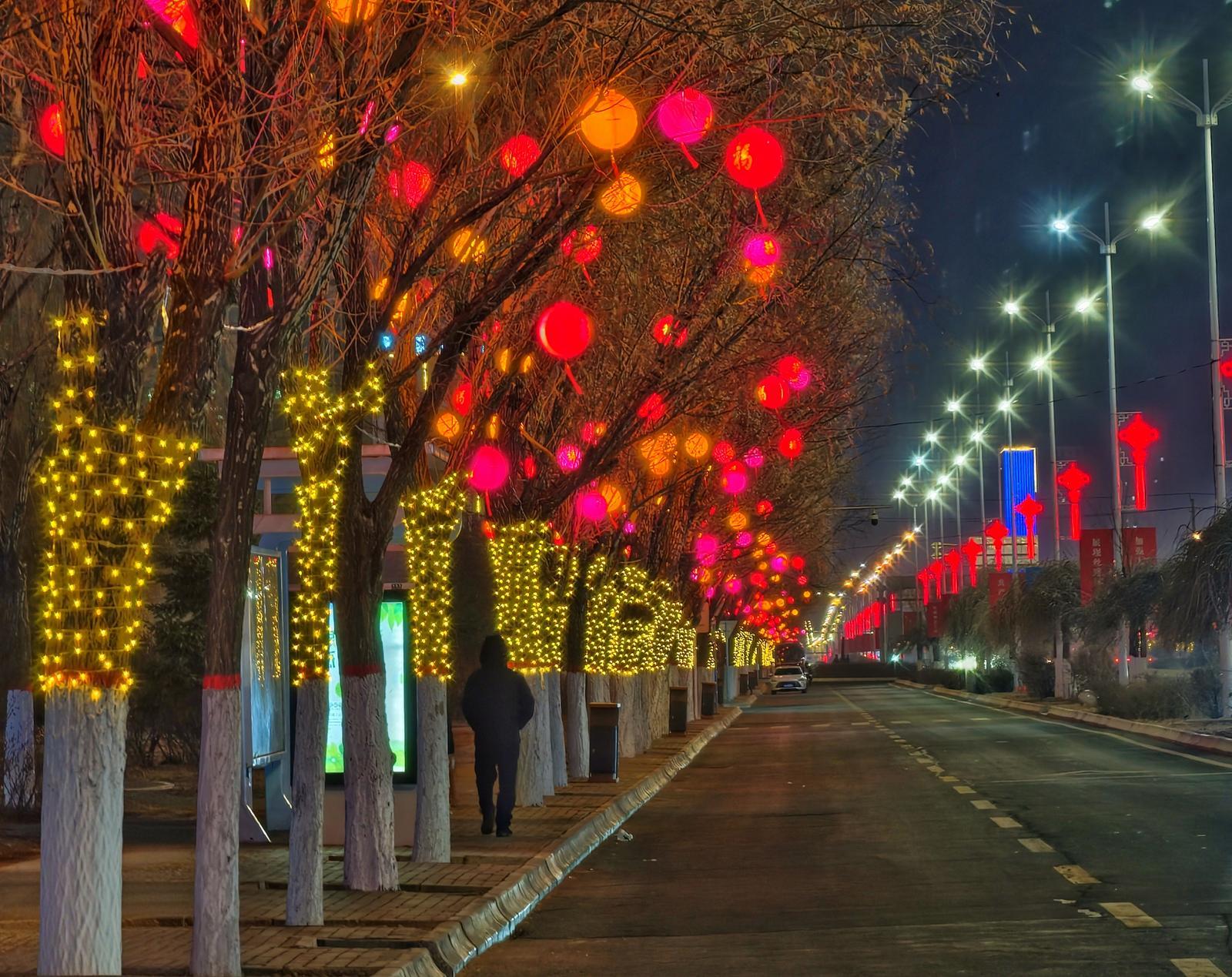 走在纬一路、经十路、纬二路、机场路、经十一路等新区城市主干道,在道路两侧行道树及部分绿化带、中分带共计2000余棵乔灌木上,布设网灯、灯串、水果灯、福字挂饰、流星雨灯串、红灯笼等各式灯饰25000余件,灯饰交相辉映,宛如一条条流光溢彩的“星光大道”。