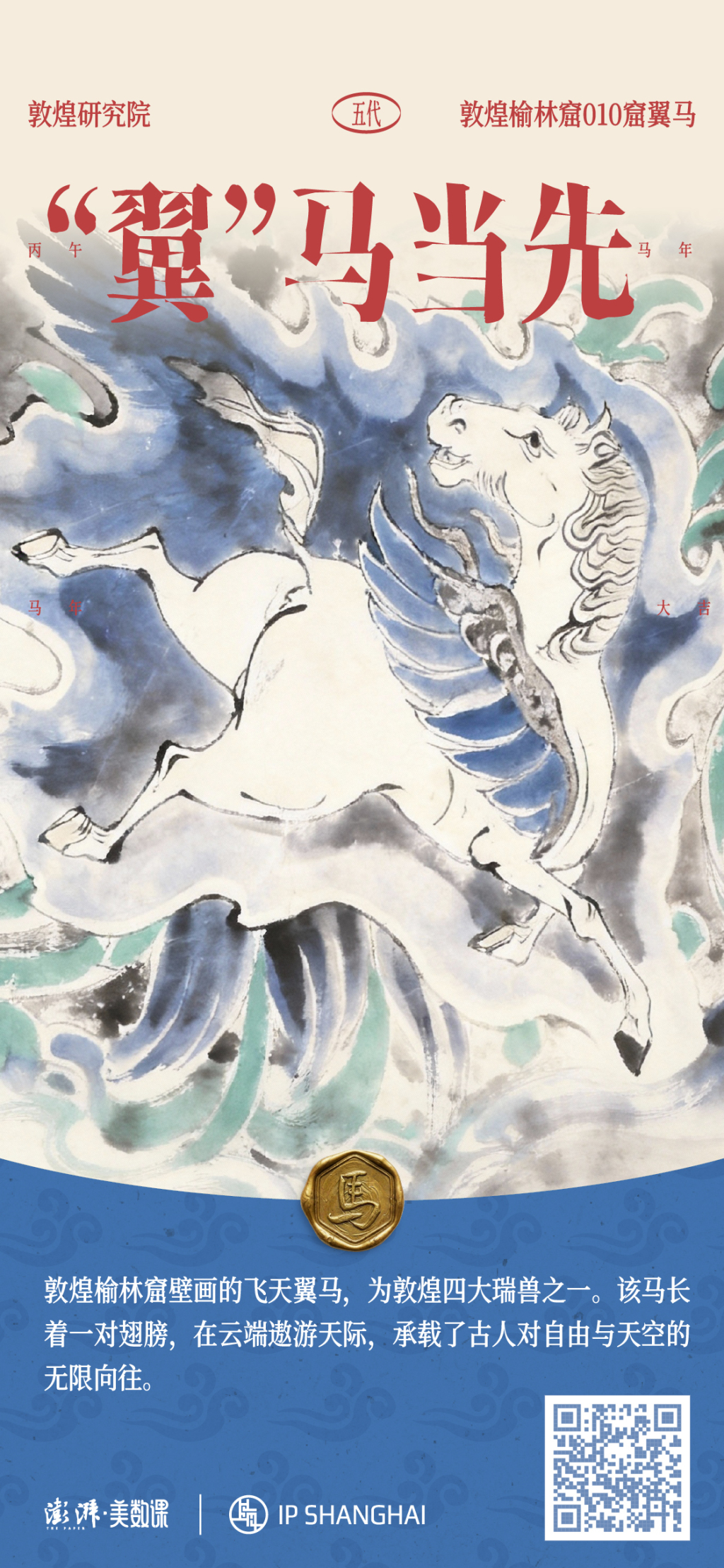在更广阔的想象中,“天马”还是长着一对翅膀、能飞天的翼马。这一形象在莫高窟、榆林窟等诸多洞窟的壁画里都能见到,是敦煌壁画四大瑞兽之一。