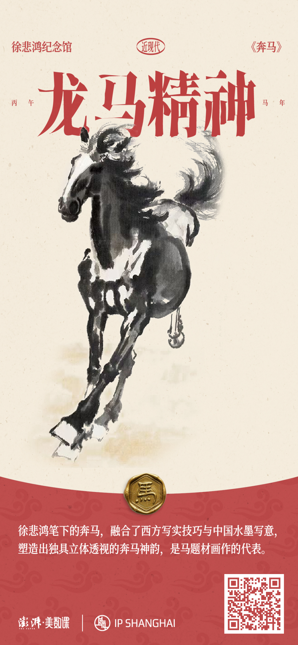迄今墓葬出土玉器中较早的玉马形象,和甲骨文中的“马”字形神契合,照见了华夏文字与文明交融的开端。抗日战争时期,徐悲鸿创作的《奔马》融合西方写实技巧与中国水墨写意,勾勒出骏马昂首腾跃的雄姿,展现出激昂的斗志与决心。