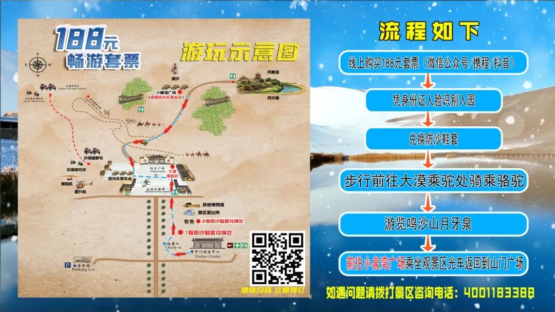 专属优惠套餐:188元畅游套票,包含景区半价门票、登沙山必备的防沙鞋套、热门的大漠乘驼项目和景区观光车,用更轻松、更实惠的方式,深度感受大漠魅力。