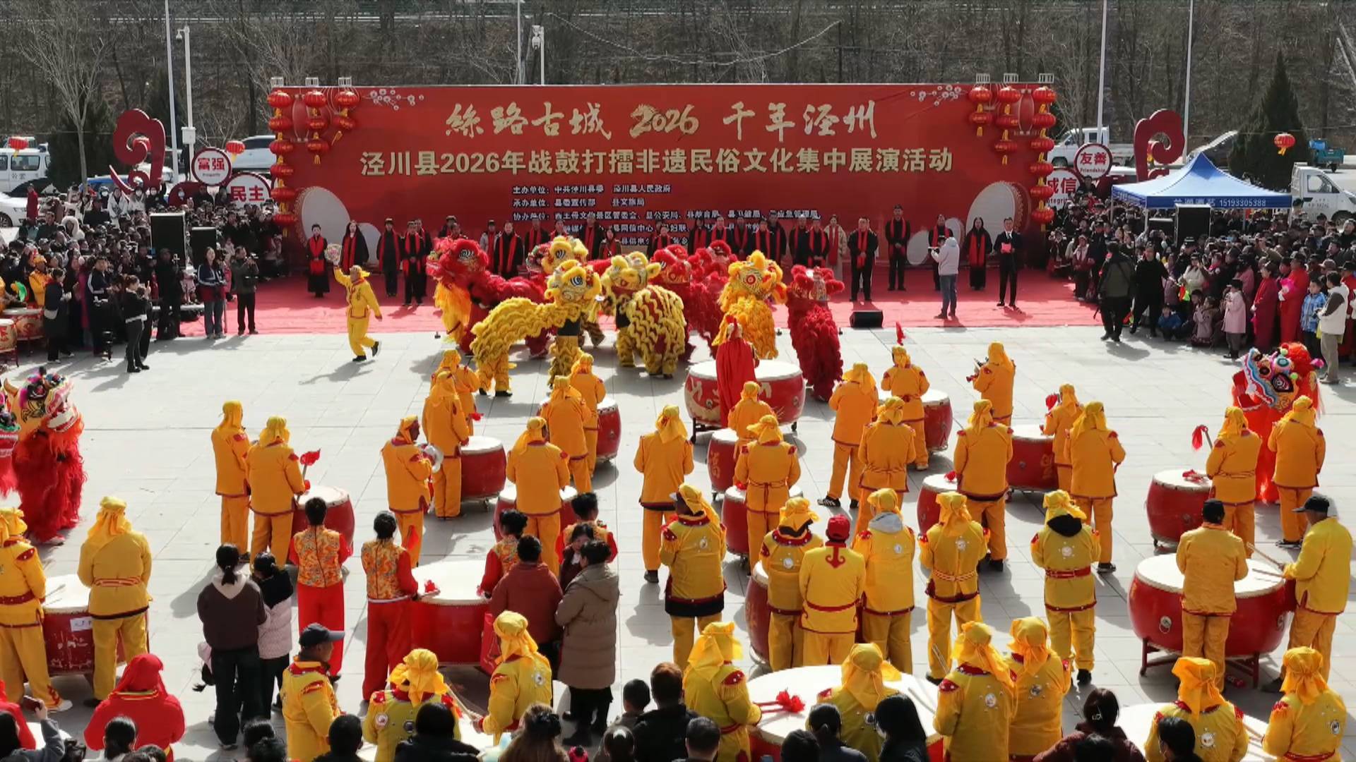 2月10日,农历腊月二十三,是北方的小年。在泾川县城北新区文化广场,战鼓震天响,非遗年味浓。下午13时,一场以“战鼓迎春·奋进泾州”为主题的非遗民俗集中展演火热开展,来自全县各乡镇、社区的20支战鼓队与民俗表演队伍汇聚一堂,用传承千年的鼓乐艺术擂响了迎接新春的喜庆乐章。