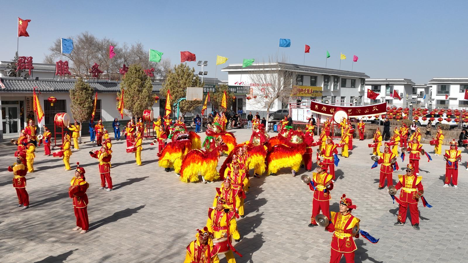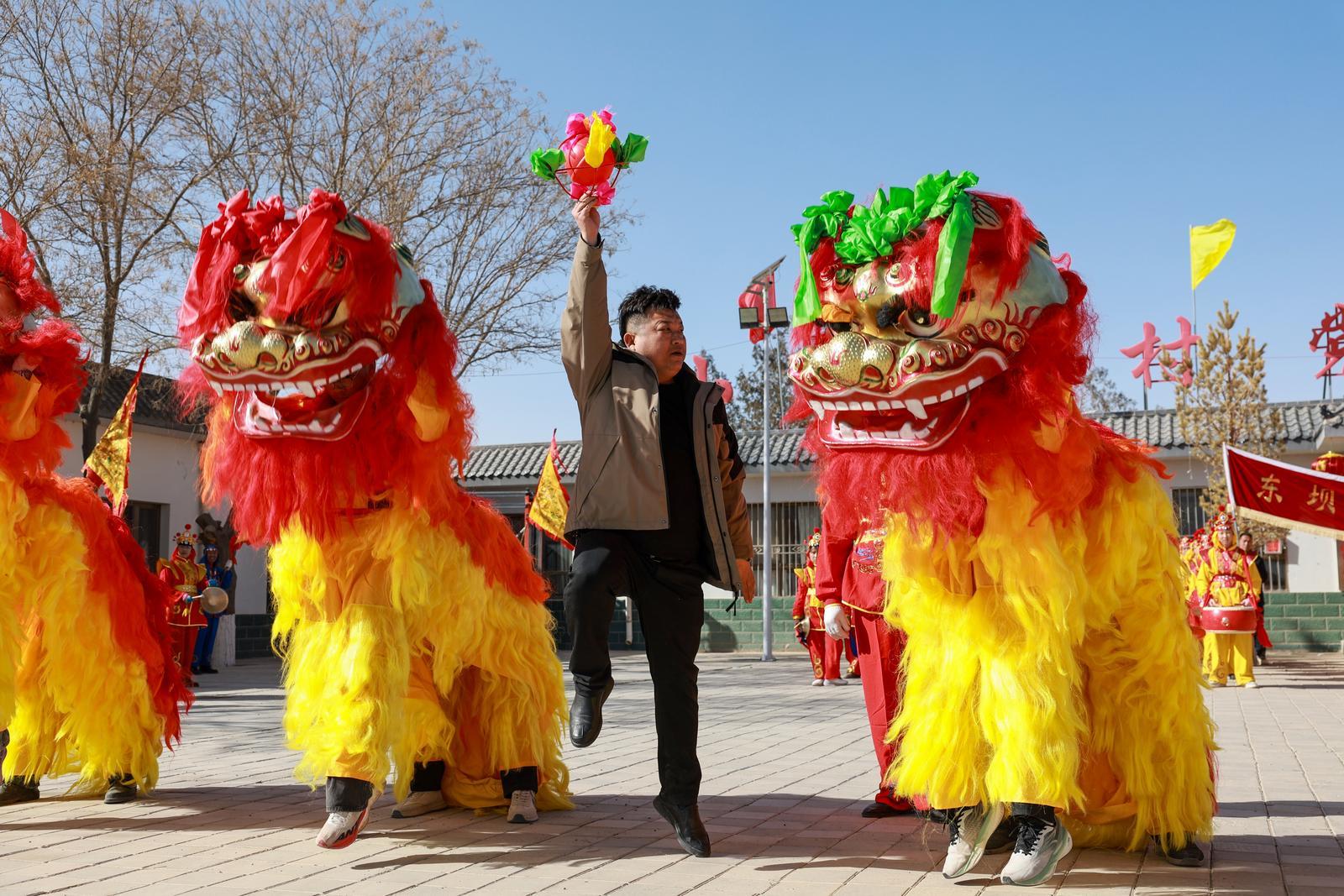 2月11日,在金塔县东坝镇小河口村社火排练现场,社火队的队员们正在排练舞狮子、打锣鼓等传统民俗文化社火,迎接即将到来的春节。