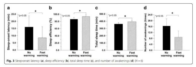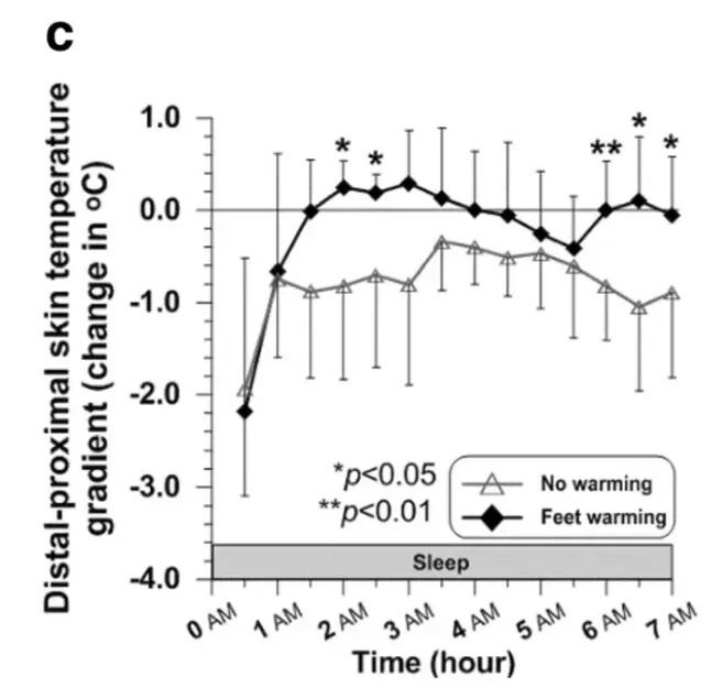 而较低的核心温度和较高的远端皮肤温度,有利于快速进入到睡眠状态中去。