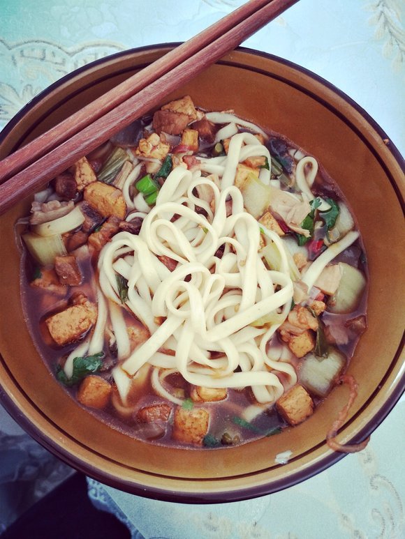 若说咸菜拌捋面是大敦煌民间美食中的“硬汉”,那么窝葫芦面条便堪称“小家碧玉”。在敦煌,百姓称南瓜为“窝葫芦”。别处或惯以南瓜熬汤,敦煌乡人却另有讲究——南瓜汤熬得浓稠香甜之后,再入手擀面条煮至熟透,起锅前撒入少许韭菜花提味。于是,一锅色香味俱佳的窝葫芦面条便大功告成。热腾腾盛上一碗,保你一口接一口停不下来。若是傍晚享用这一碗,肠胃更是舒坦。