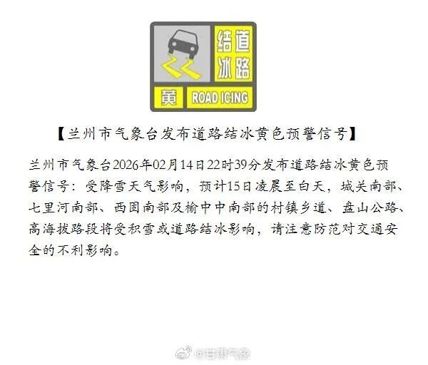 兰州市气象台2026年2月14日22时39分发布道路结冰黄色预警信号: