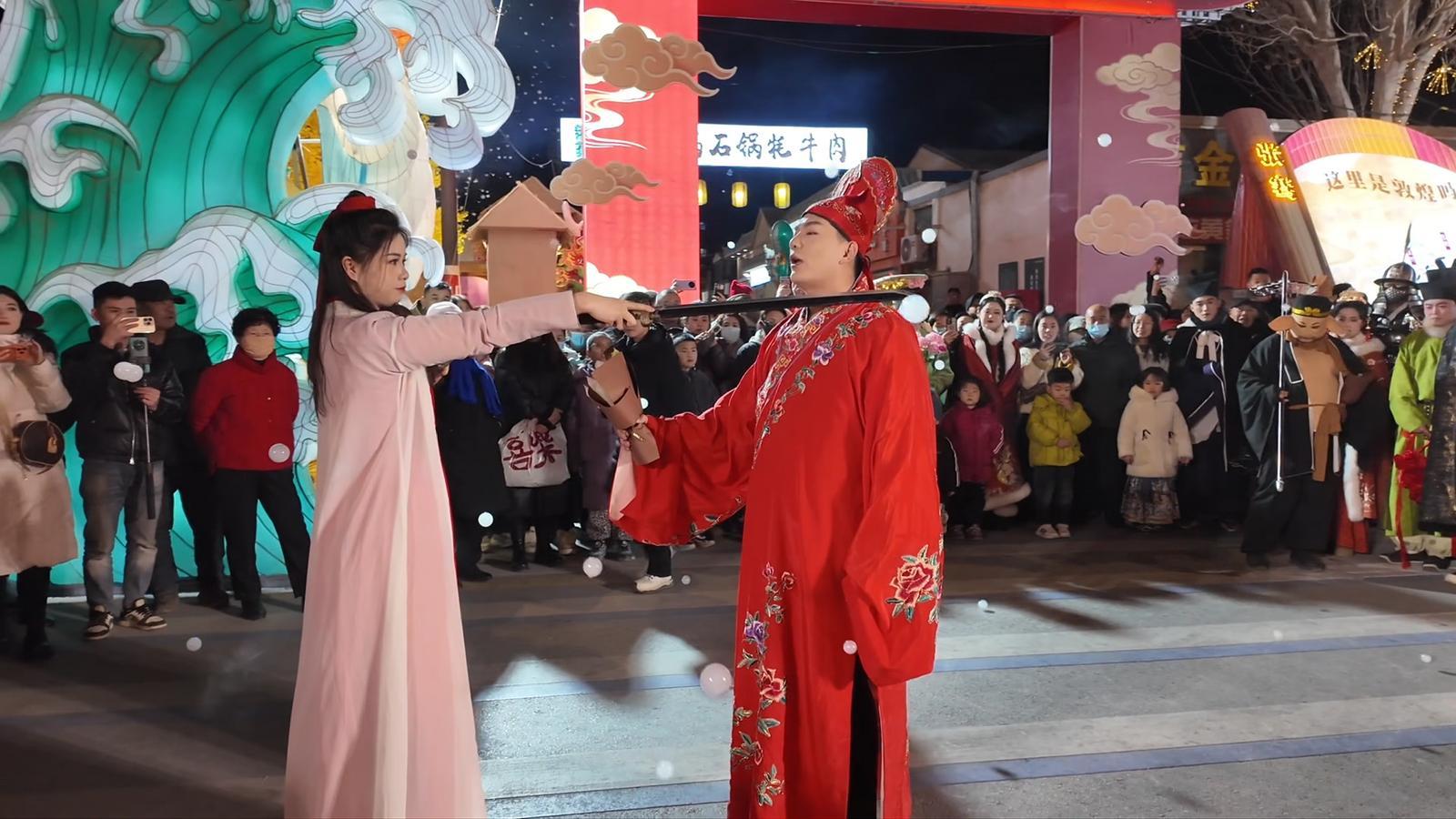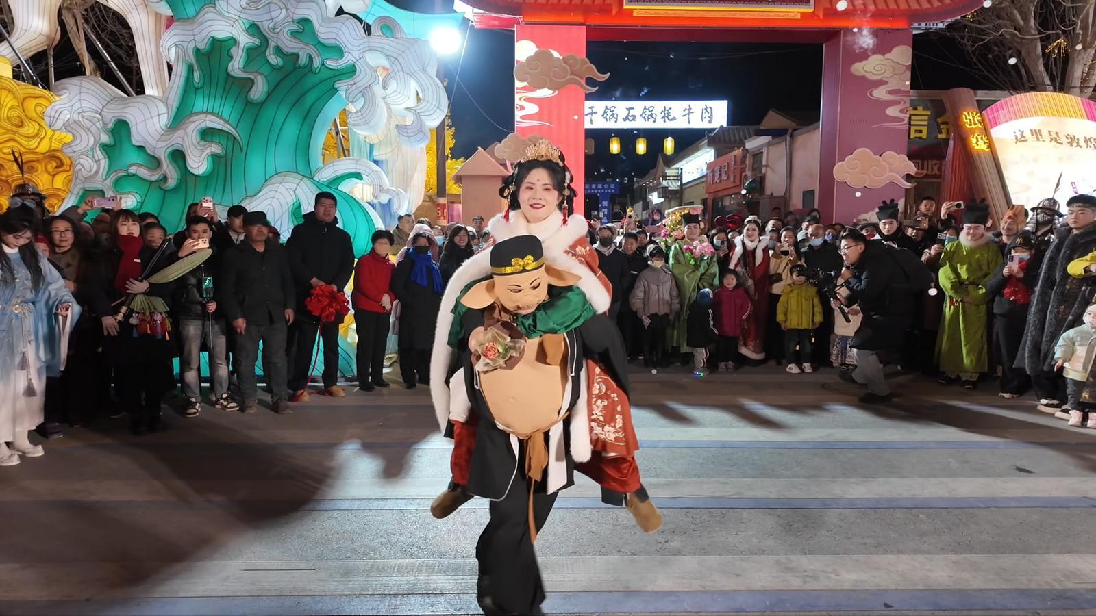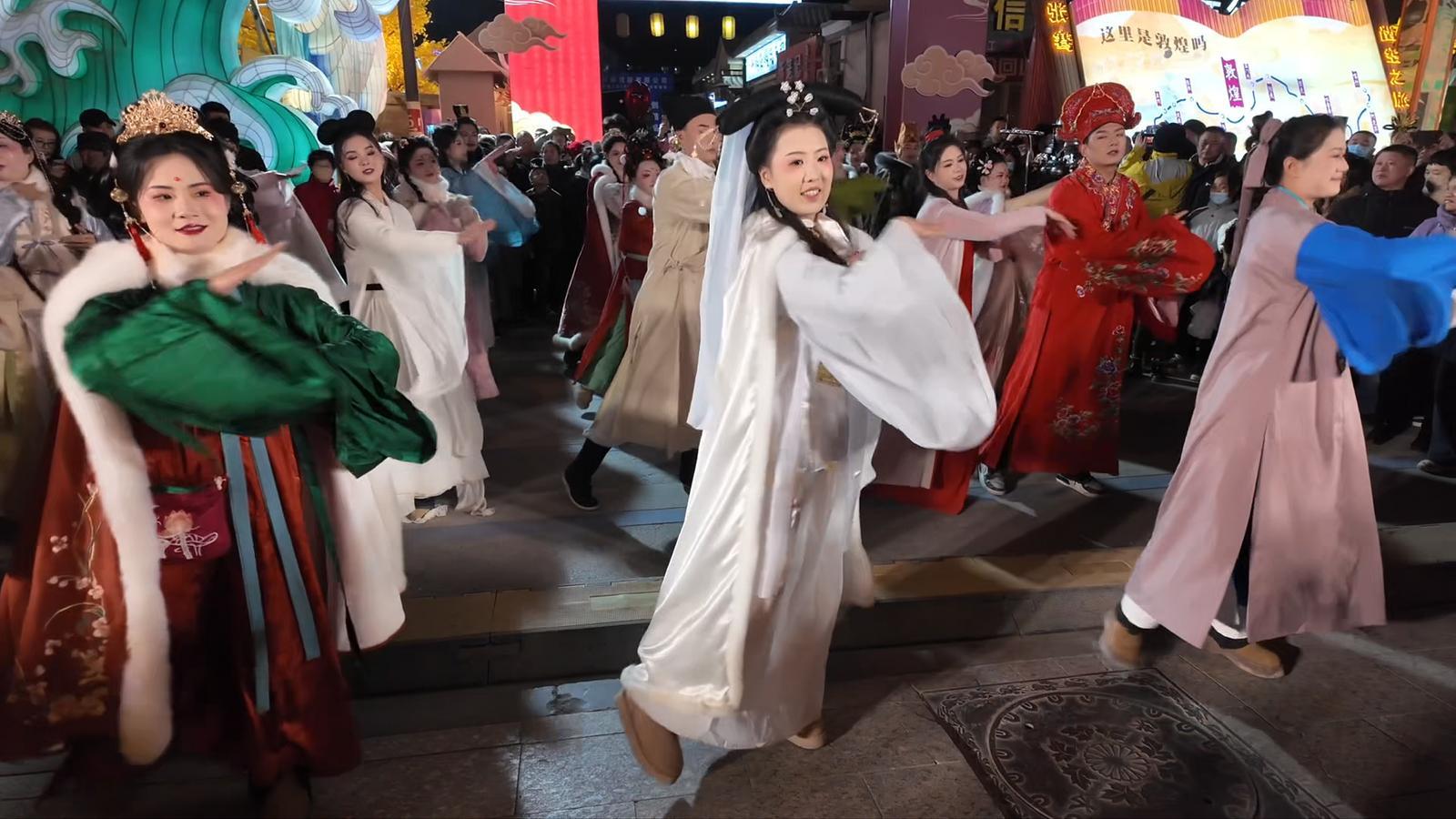 当晚,南牌坊下人头攒动,翩翩公子、猪八戒背媳妇、许仙与白娘子、紫霞仙子与至尊宝等经典国风角色轮番登场,不少游客主动加入互动,现场气氛热烈非凡。