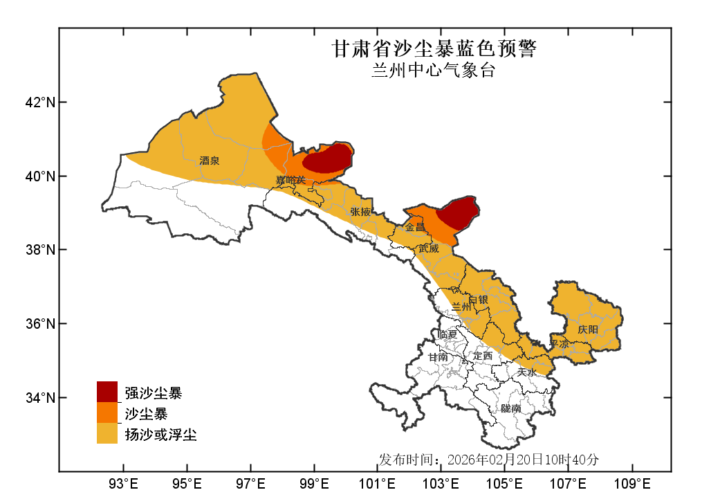 新甘肃客户端兰州2月20日讯(新甘肃·甘肃日报记者 王思璇)记者从甘肃省气象局获悉,兰州中心气象台今天发布沙尘暴蓝色预警。