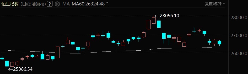 指数方面,恒生指数低开后震荡下行,开盘报26657.84点,跌幅0.18%,截至9时49分,报26385.24点,下跌320.70点,跌幅扩大至1.20%,盘中最高触及26694.34点,最低探至26382.26点。