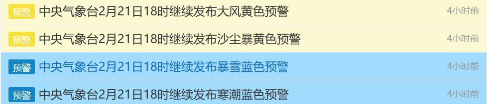 2月21日18时,中央气象台同时发布大风黄色预警、沙尘暴黄色预警、暴雪蓝色预警、寒潮蓝色预警。