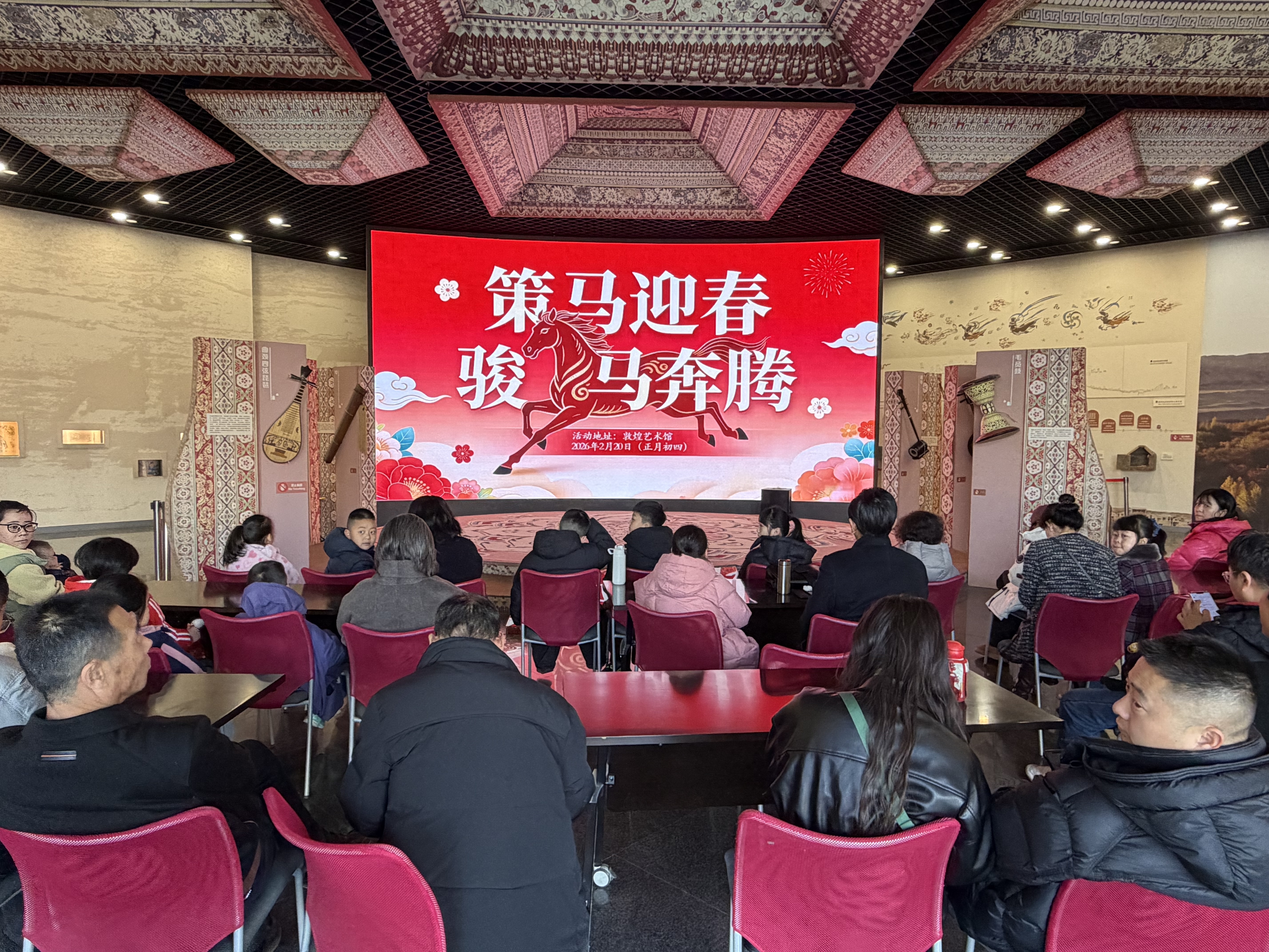 2月20日,在敦煌艺术馆内,“策马迎春,骏‘艺’奔腾”主题活动精彩上演,孩子们化身“小小寻宝家”,在《张骞出使西域图》等壁画中寻找千年骏马,踮脚探看、欢呼不断。“这儿!这里也是!”随着讲解员的细致指引,孩子们的小手纷纷指向壁画,眼神里满是好奇与兴奋。随后,深圳图书馆民族乐团团长李千龙登台献艺,一曲《赛马》激昂奏响。弓弦间,万马奔腾的气势扑面而来,现场观众屏息凝神,仿佛置身于辽阔草原。