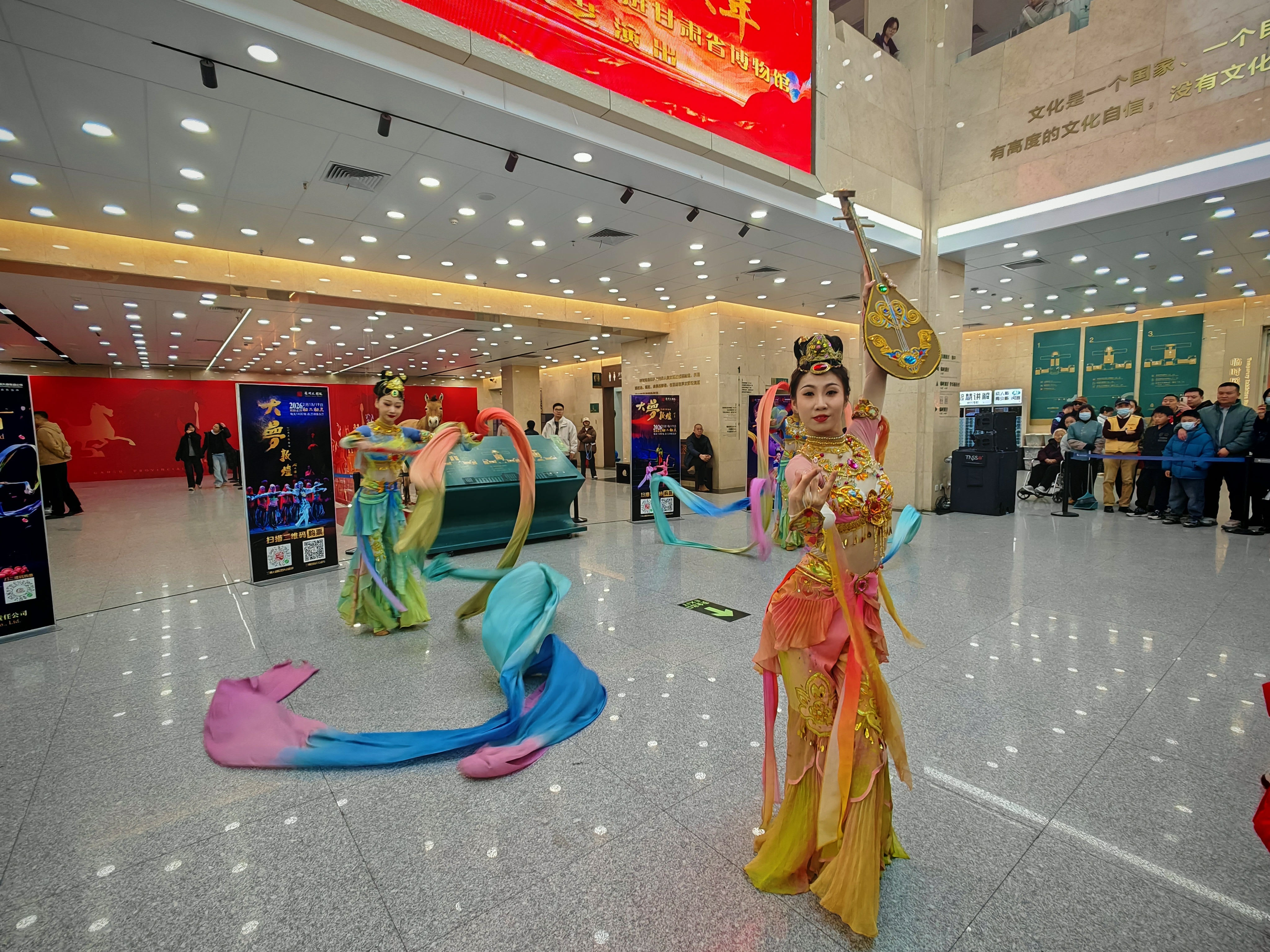 2月17日10时,随着悠扬的乐曲声响,甘肃省博物馆一楼大厅瞬间被观众包围。由甘肃省歌舞剧院带来的敦煌古乐、经典民乐、特色舞蹈沉浸式展演,为现场观众带来了一场丝路艺术的震撼体验。《金光千佛》《战马奔腾》《反弹琵琶·长绸舞》等经典节目接连上演。来自湖北的游客阮子航大年初一专程前来打卡,她兴奋地说:“我们从湖北来,兰州是西北游第一站,接下来还要去张掖、敦煌,专门来省博就是感受丝路文化。我本身学音乐,这里敦煌味的舞蹈和民乐特别惊艳,和湖北完全不一样,丝绸之路的文化魅力太吸引人了。”