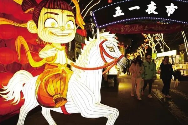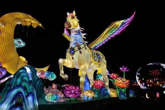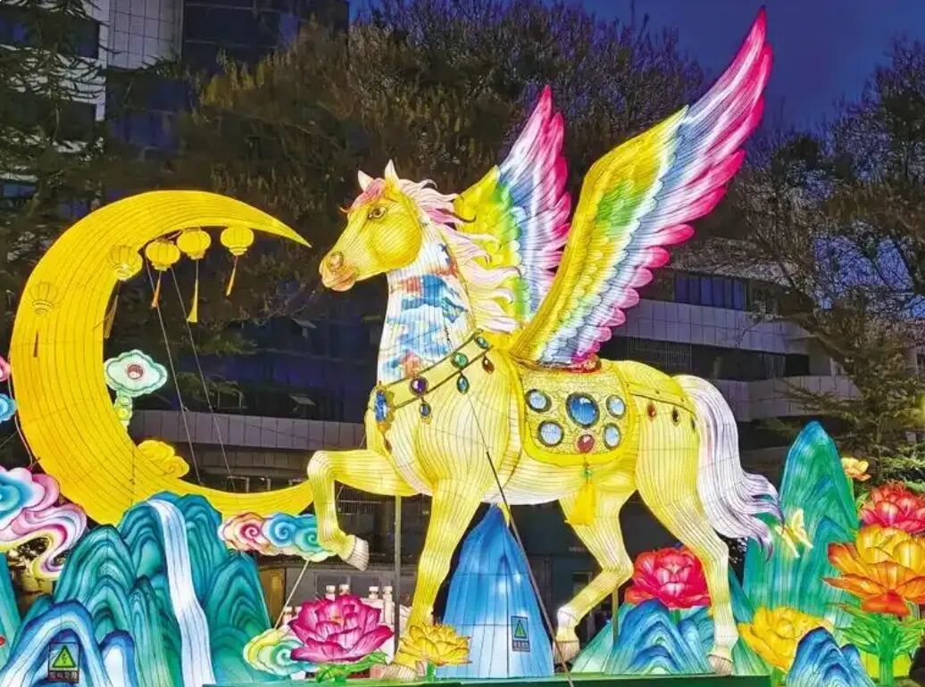 本届灯会以马年为主题,融合传统年味、陇原风情与时代气象,数十组大型灯组错落排布,造型精巧、气势恢宏,一步一景皆有新意。《骏马奔腾》灯组气势昂扬,彩马踏云而来,神采飞扬,既呼应马年新春,也寓意着新一年奋发向上、前程似锦。《福禄呈祥》《万象更新》等传统灯组,以葫芦、瑞兽、花鸟为元素,谐音寄意,藏着中国人最朴素的吉祥祝福。黄河文化、丝路风情灯组独具特色,将黄河母亲、丝路驼铃、长城关隘等意象融入光影之中,让游客在观灯之际,读懂兰州作为丝路重镇的历史底蕴。