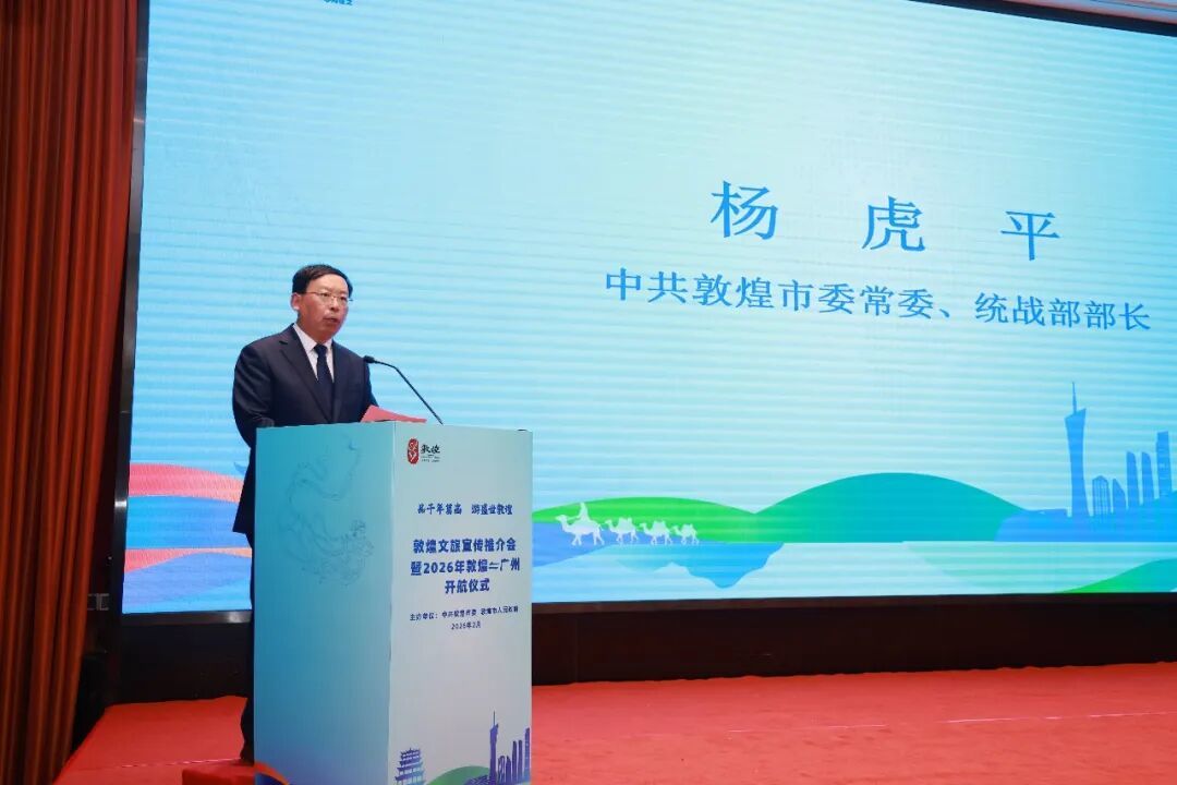 羊城春暖,丝路传情。2月26日,“品千年莫高 游盛世敦煌”敦煌文旅宣传推介会暨2026年敦煌=广州航线开航仪式在广州成功举办。本次活动由甘肃省人民政府驻广东办事处指导,敦煌市委、市政府主办,广东省甘肃商会协办,既是敦煌与广州深化文旅交流合作的重要举措,更是敦煌=广州航线正式通航的重磅预热,标志着西北丝路明珠与华南大湾区核心枢纽的互联互通迈入全新阶段,两地文旅融合发展迎来全新契机。